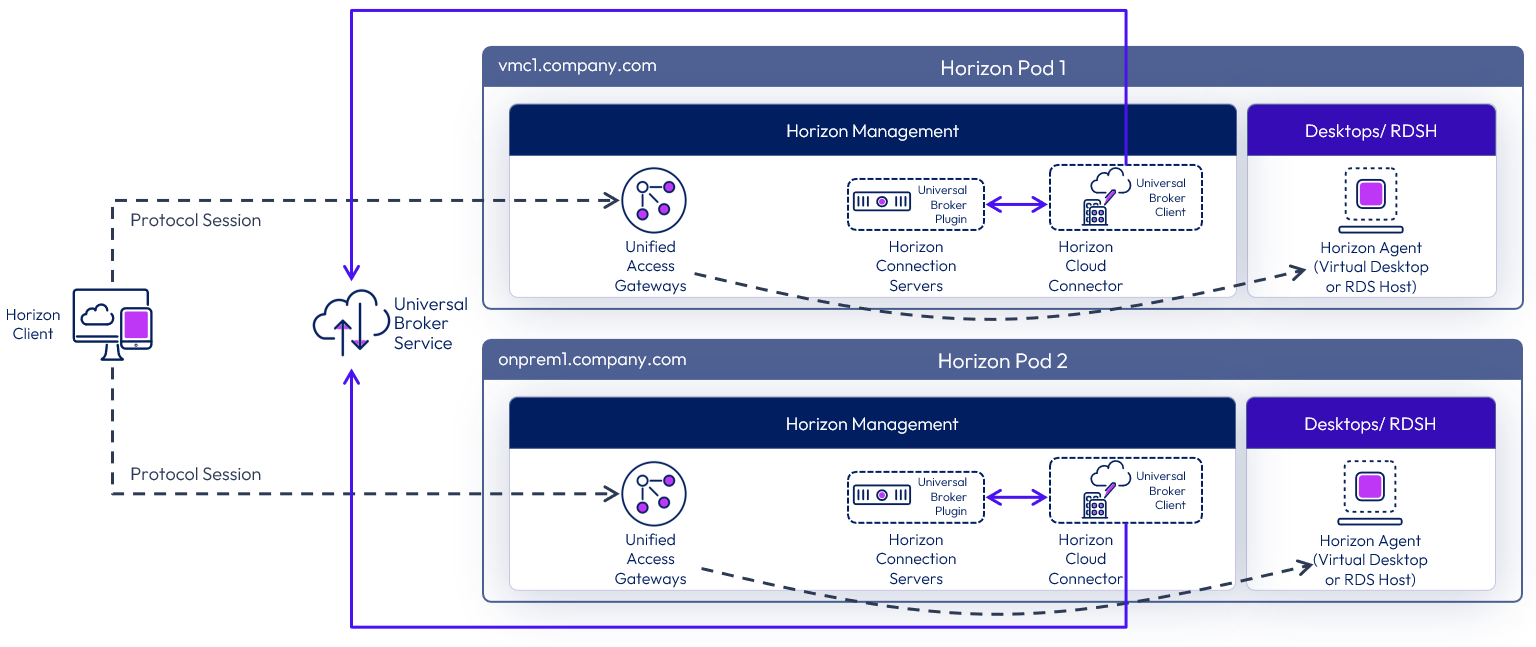 The Horizon Universal Broker is the cloud-based brokering technology used to manage and allocate Horizon resources from multi-cloud assignments to end users. It allows users to authenticate and access their assignments by connecting to a single fully qualified domain name (FQDN) and then get directed to the individual Horizon pods that will deliver their virtual desktop or published applications. To facilitate user connections to Horizon resources, each Horizon Pod has its own unique external FQDN. See Scaling deployments.