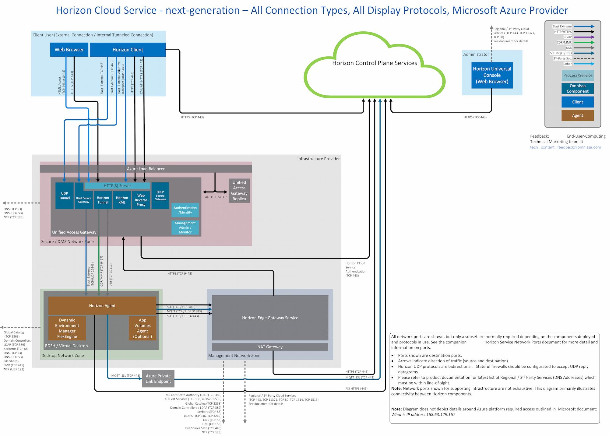 This document provides port and protocol requirements for connectivity between the various components and servers in an Omnissa Horizon® Cloud Service™ next-generation deployment on a cloud-native infrastructure. This document is intended to be a companion to the Port and Protocol Requirements for Your Horizon Cloud Deployment in Microsoft Azure from the product documentation, which provides ports and protocols in tabular format. The tables tell you which ports must be opened for traffic from the end users' connections to reach their pod-provisioned virtual desktops and remote applications, as well as how to choose how your end users will connect.