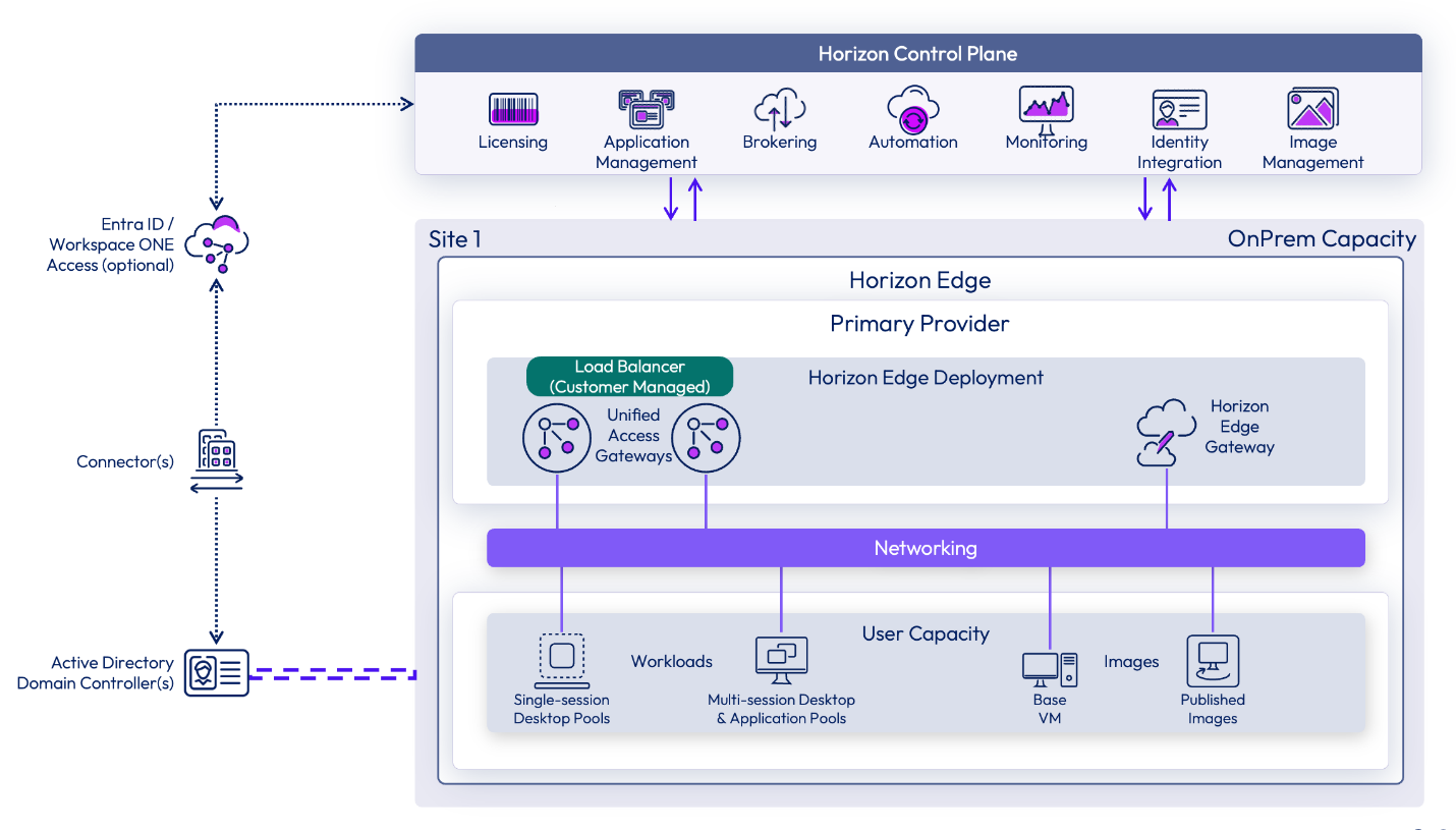 Horizon Control Plane services are managed by Omnissa and hosted within Microsoft Azure environments. Customers fully manage data stored in their capacity provider. Omnissa provides disaster avoidance and recovery for top-layer and user-management interfaces which are owned and operated by Omnissa.