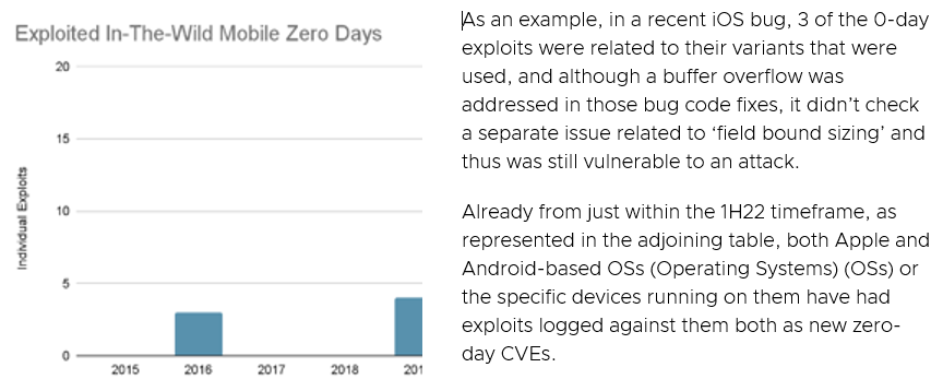 Early 2022 tracking of all major vectors e.g. Apps & OS’s, clearly reinforces the previous section. When you combine the above Table 4’s tracking of Chromium, those and the ones in Table 5 emphatically provide concrete evidence that indeed ‘no OS or OEM is shielded’. As these Common Vulnerability & Exposure (CVE)s from MITRE > CISA continue to pile up, each is providing a window of opportunity for a malicious actor to take advantage of while the OEM is developing a patch, or by the time that the end-user gets one or actually ‘implements’ it?
