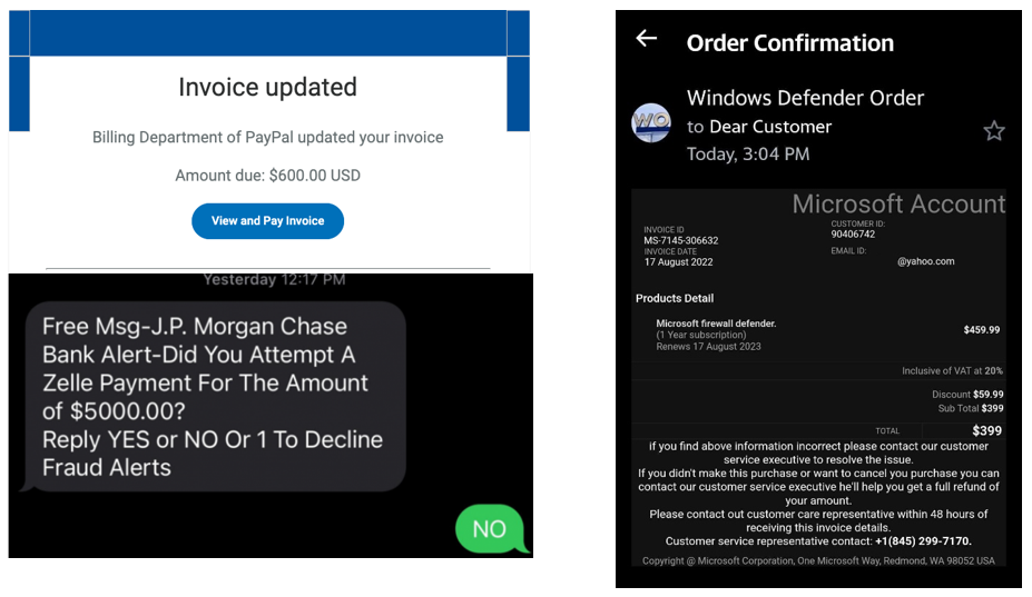 - SMShing: Thousands of people a year are victims of SMS phishing (A.K.A. smishing) attacks as more people have started using mobile phones for banking, and cybercriminals have found a way to obtain their data. They send fake SMS or other mediums, such as in-app messaging or vendor platform messaging (ex. Apple’s iMessage), pretending to be the bank, asking users to click on a malicious link that steals their confidential information. These typically fall out of the normal corporate domain and can be missed by permitter / network defenses for that reason.