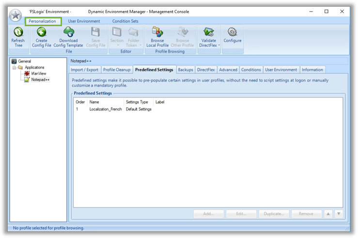 Enable personalization for those applications that would benefit from predefined settings or self- support. Leverage the DirectFlex option so custom settings are read from and written to the network share at application start and stop. Any remaining application customizations will be persisted by the Profile Container.