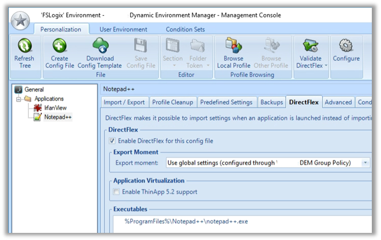 Figure 14 - DirectFlex Settings for Notepad++ on the Personalization Tab of the Console