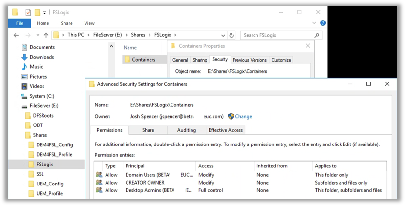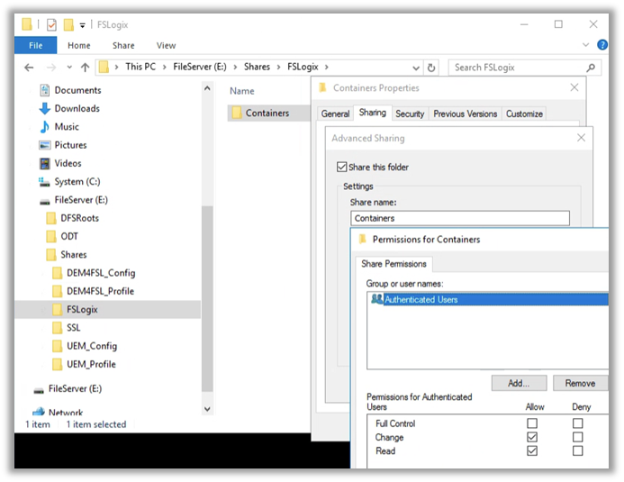 \\<FileServer>\FSLogix\Containers - Share the folder and configure the following share permissions: