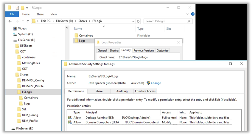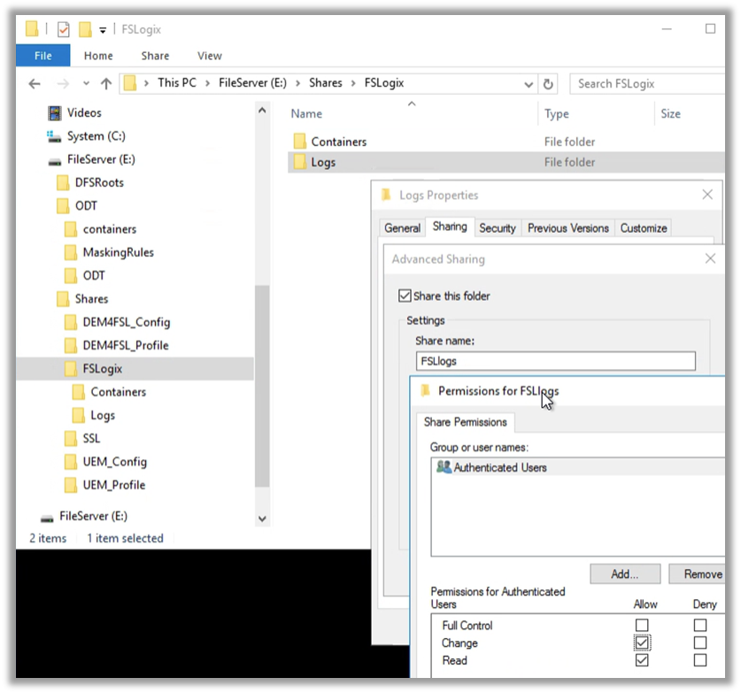 \\<FileServer>\FSLogix\Logs - Share the folder and configure the following share permissions: