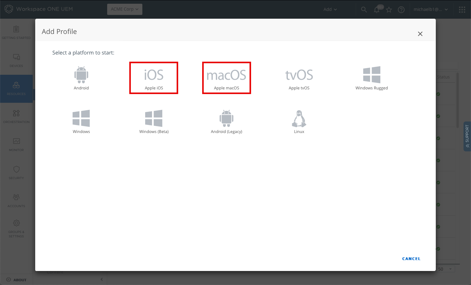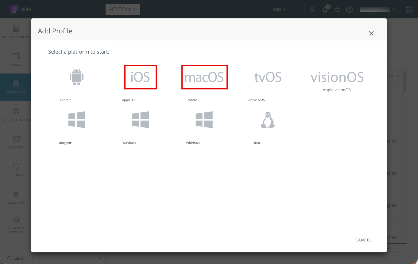 Figure 7: Device profile platform selection in Workspace ONE UEM.