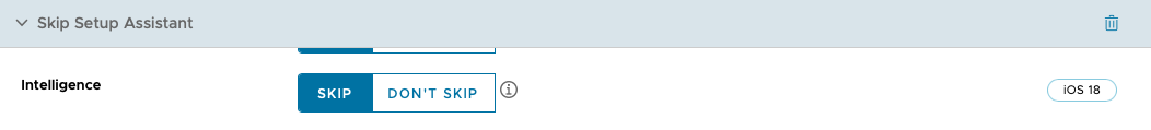 New to macOS Sequoia 15 and iOS 18 is new panes within Setup Assistant for configuring Apple Intelligence options. Workspace ONE provides a new key within the Skip Setup Assistant payload for restricting the Apple Intelligence configuration on iOS during Setup Assistant.