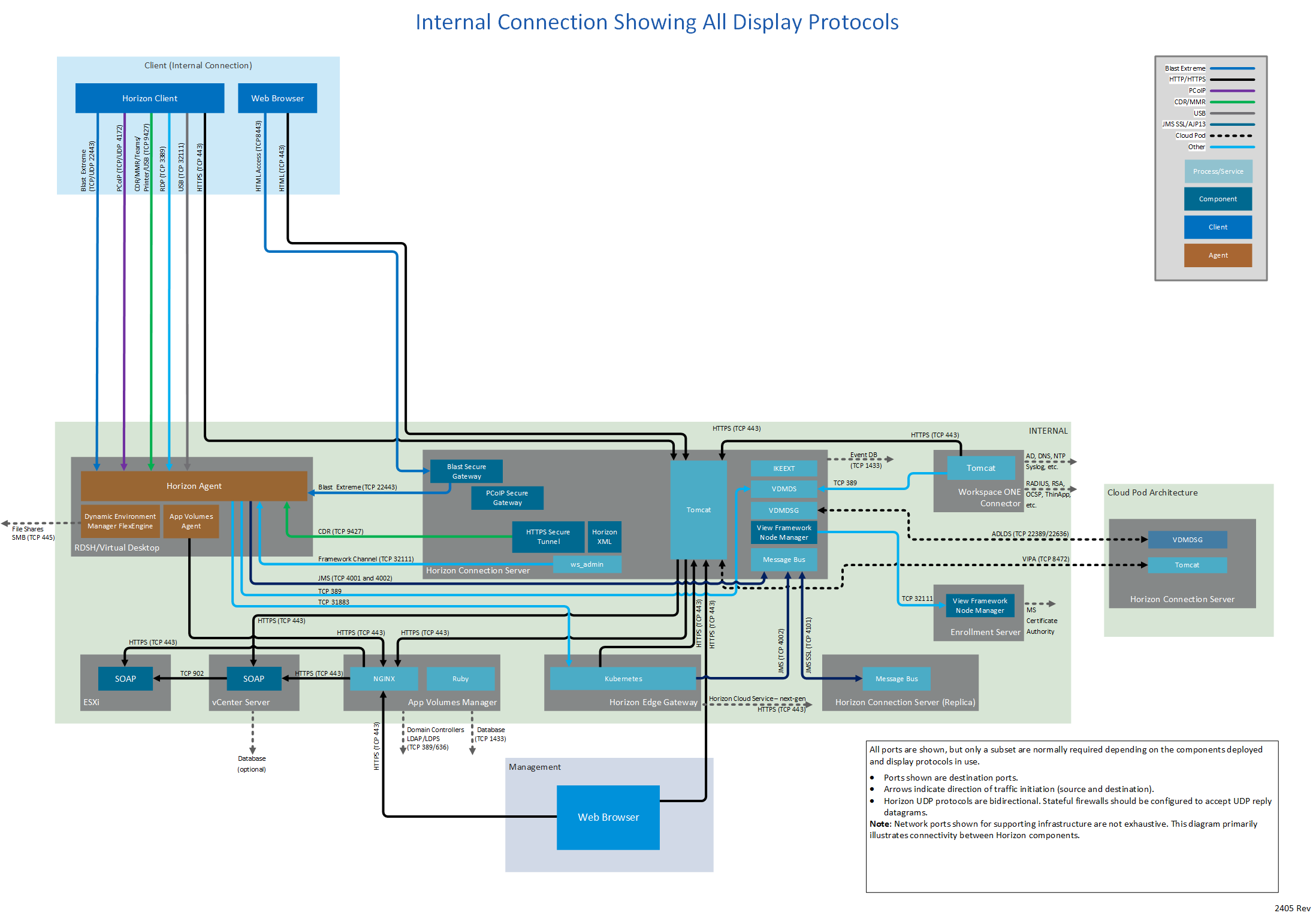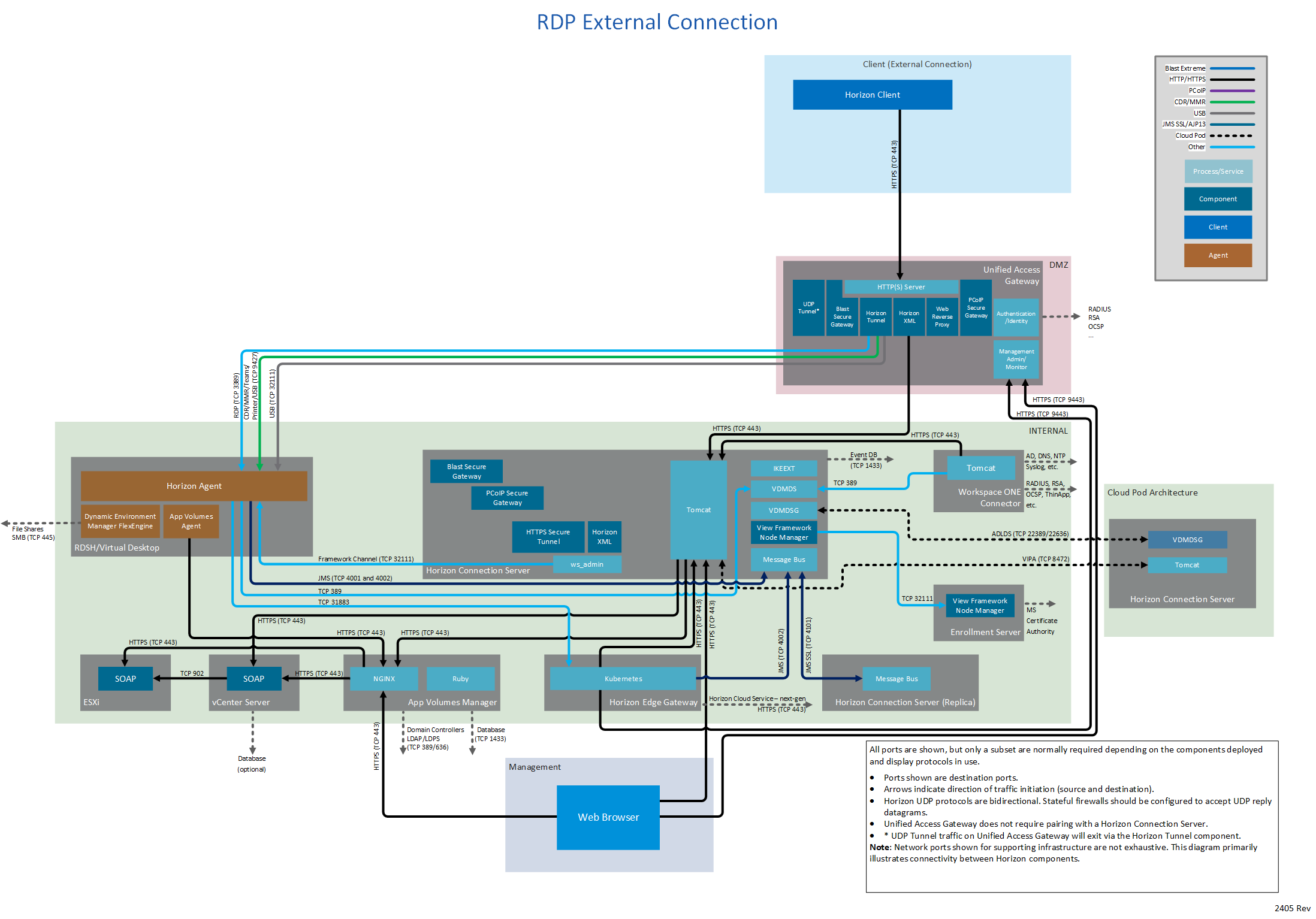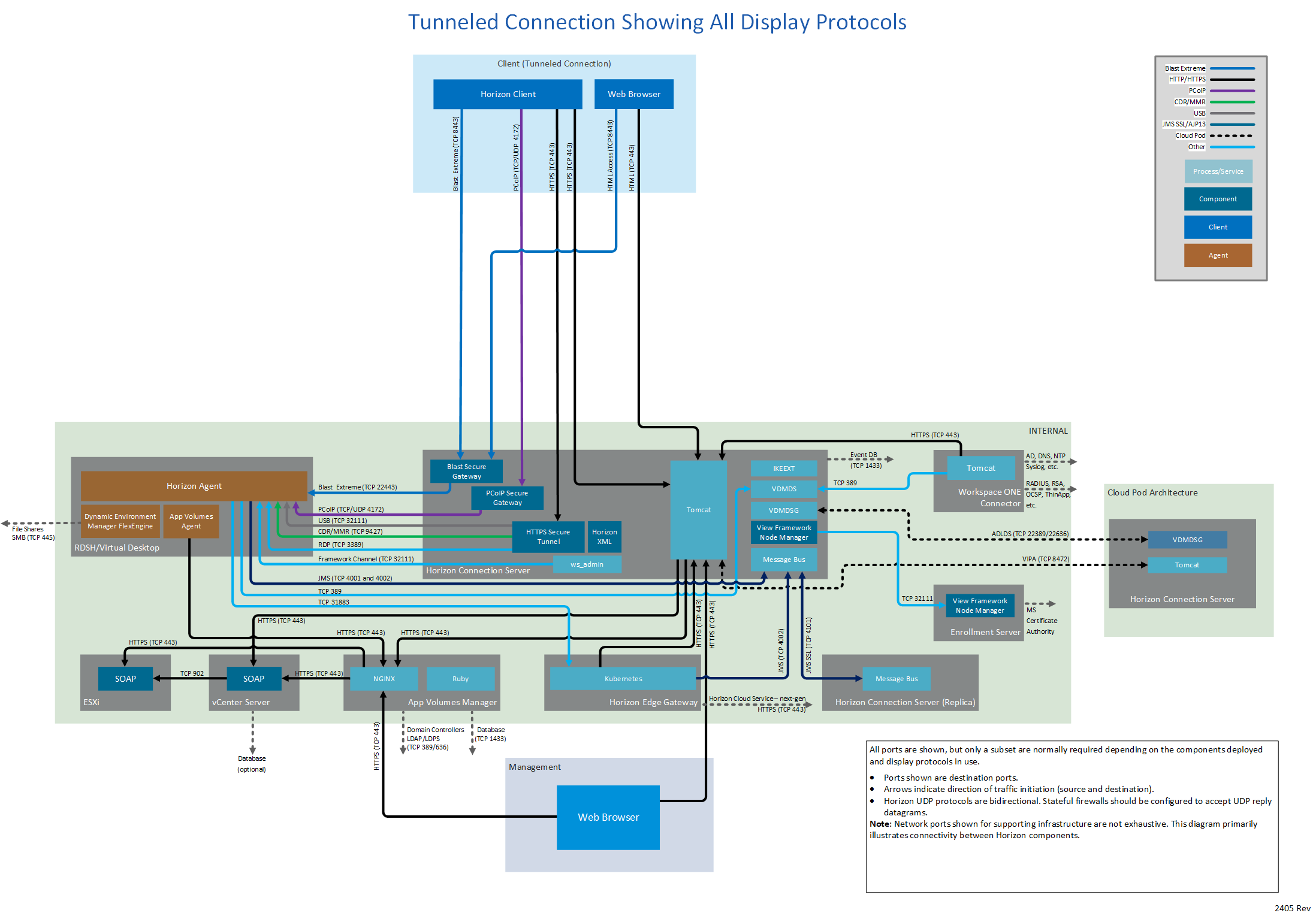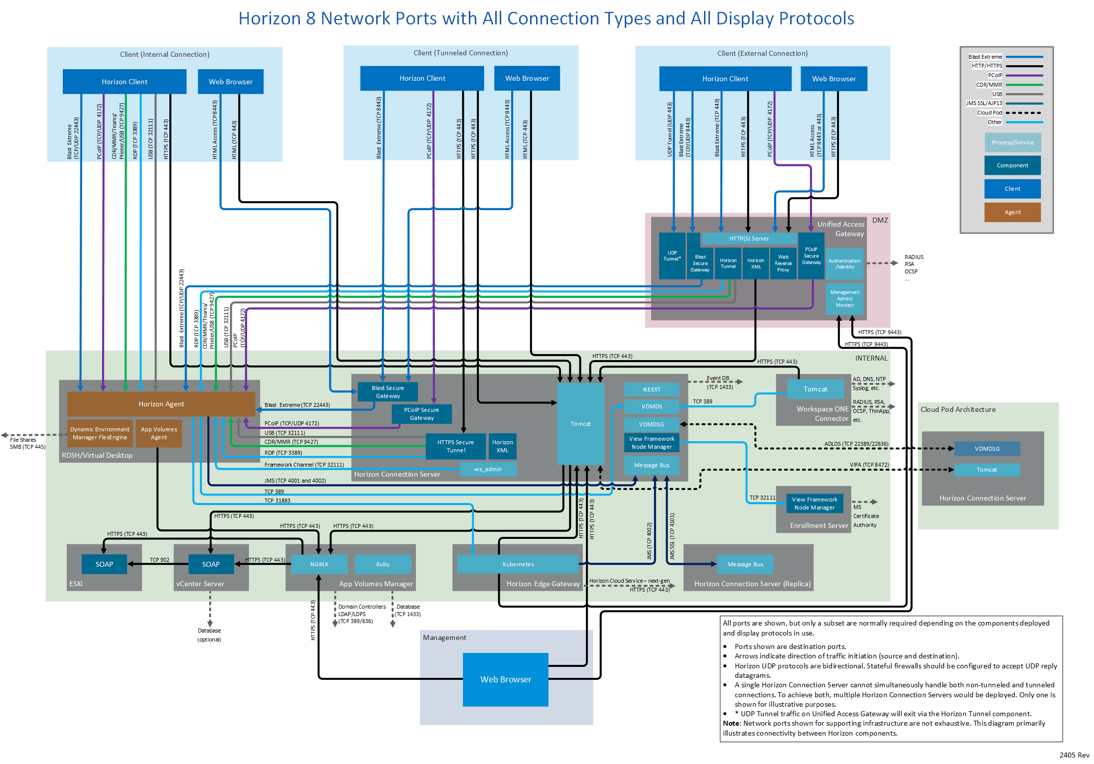 Figure 1: Horizon 8 network ports with all connection types and all display protocols