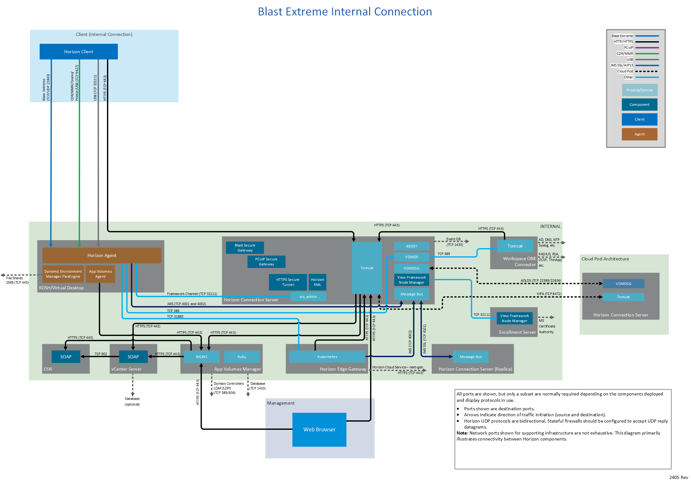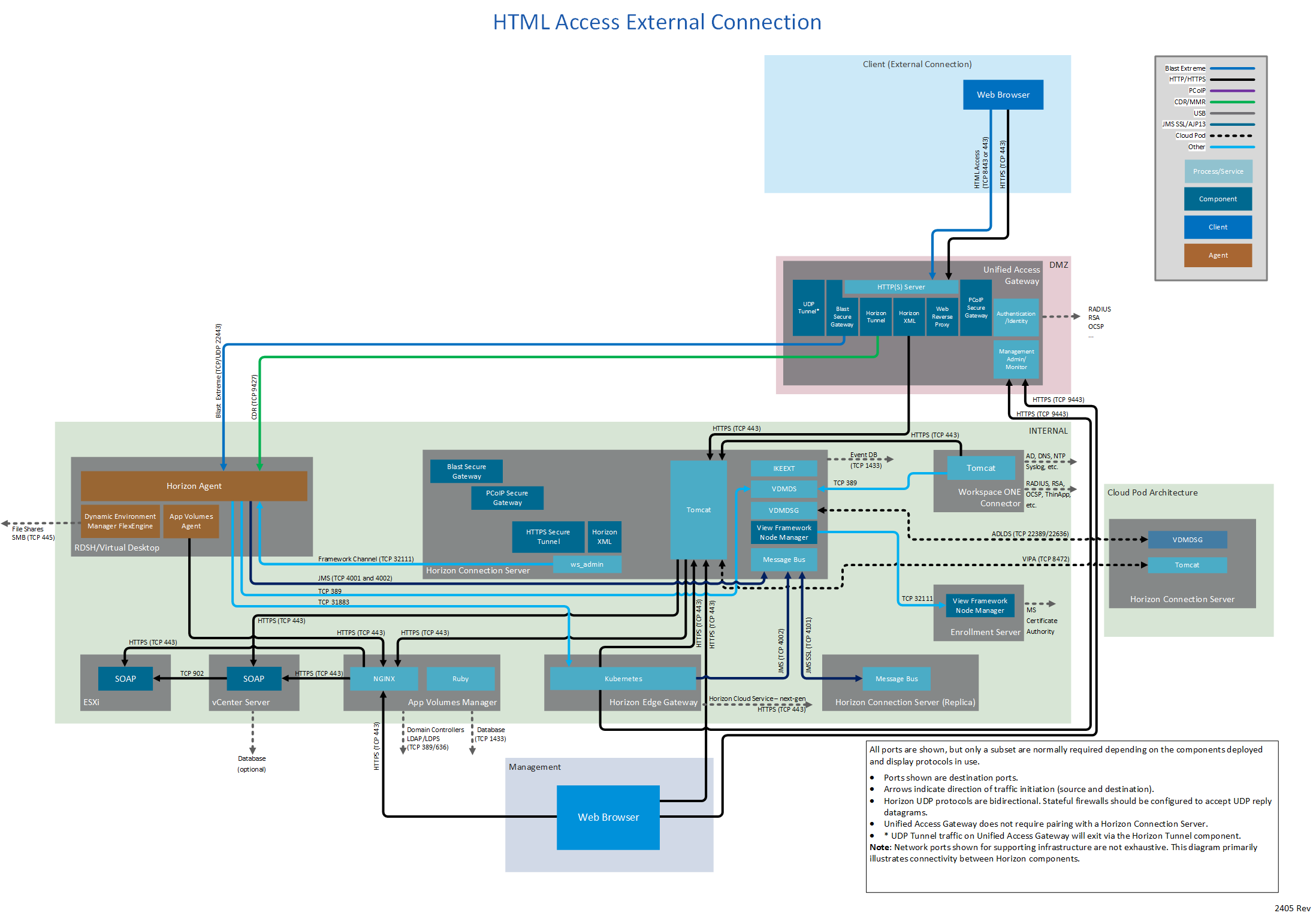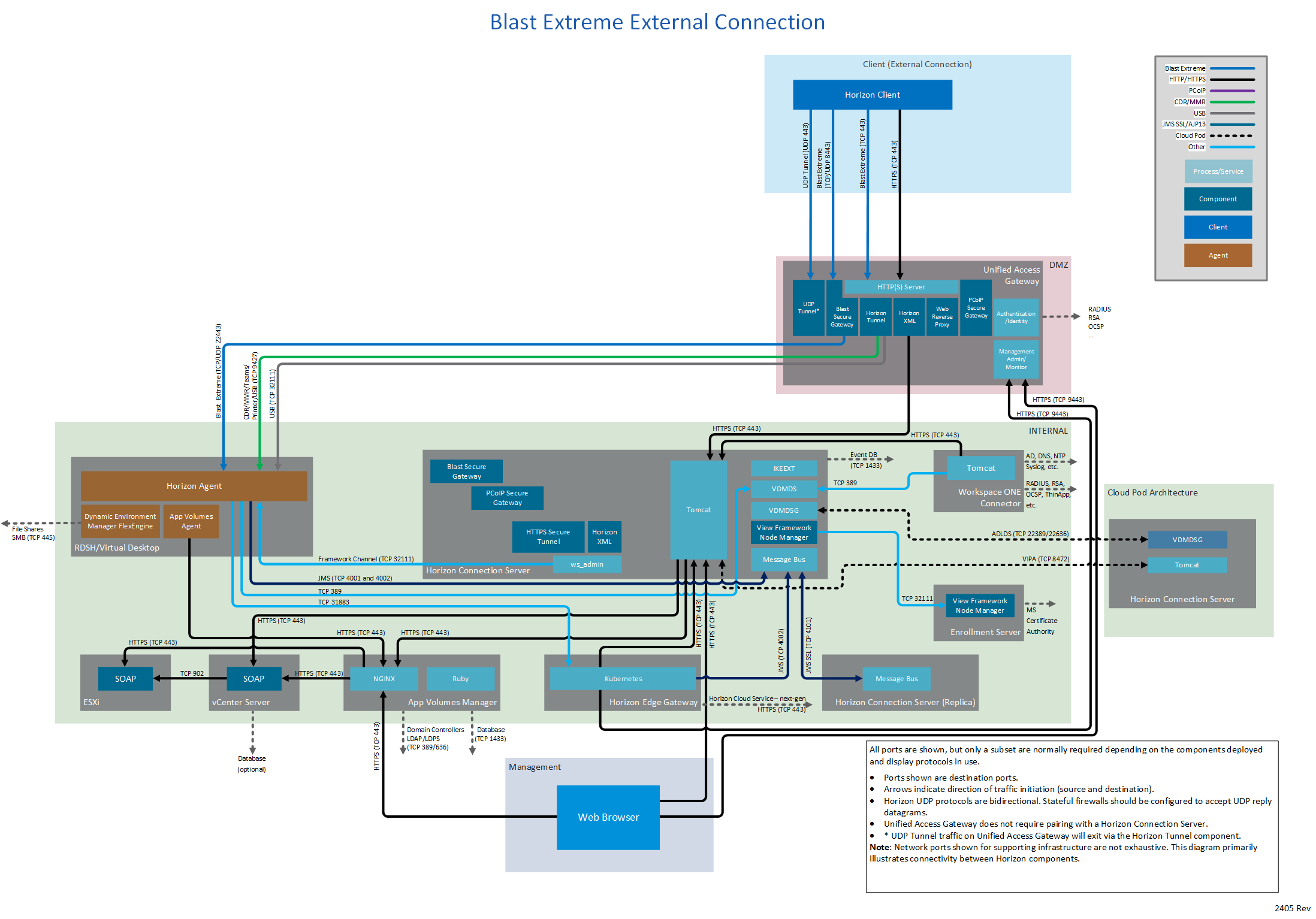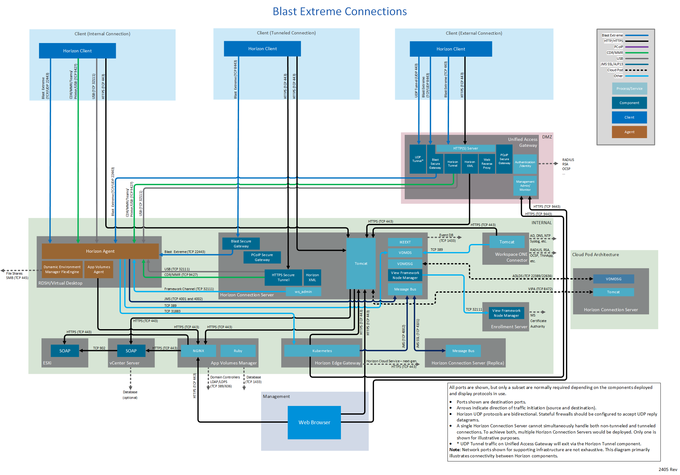 Figure 1: Horizon 8 network ports with all connection types and all display protocols