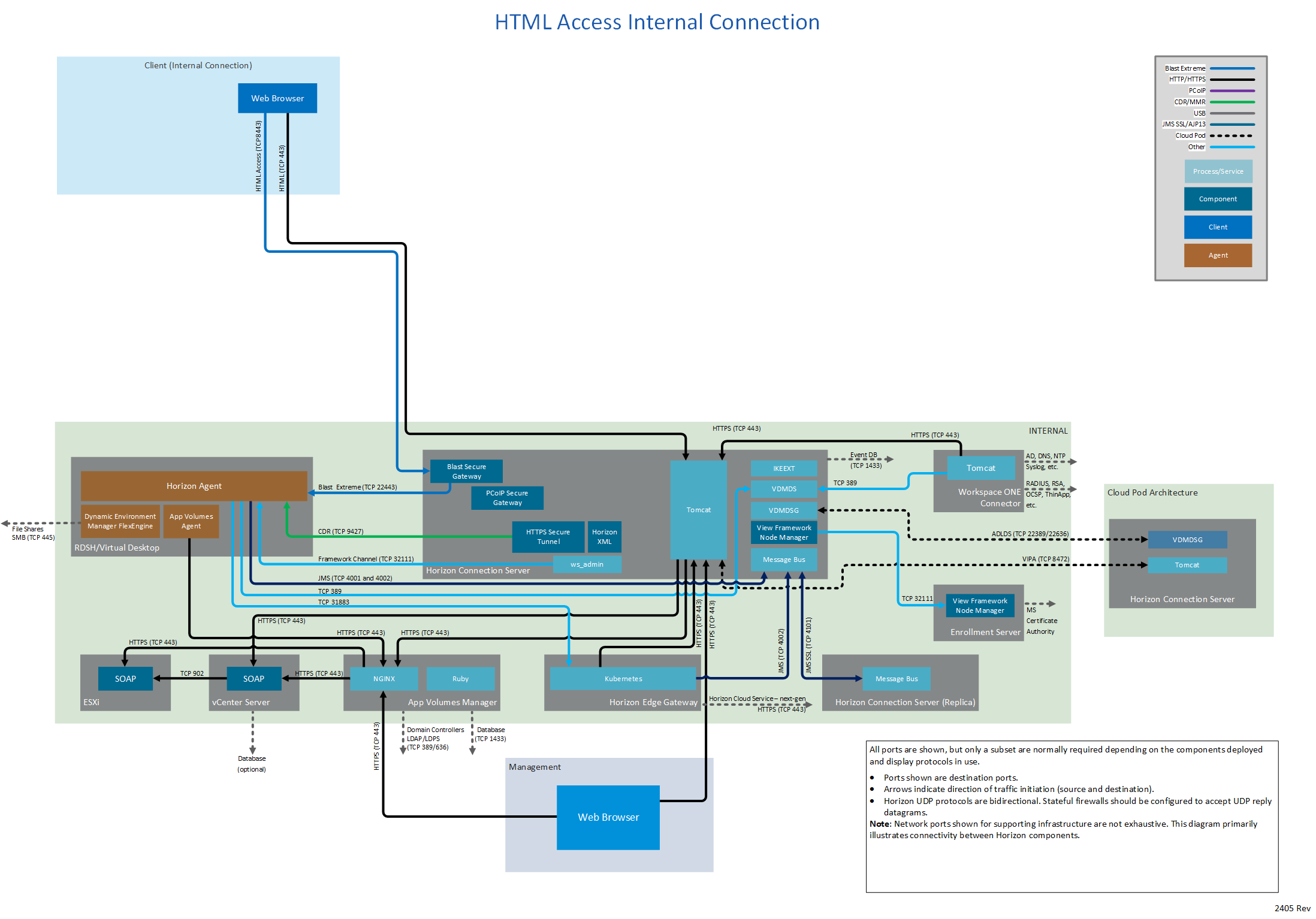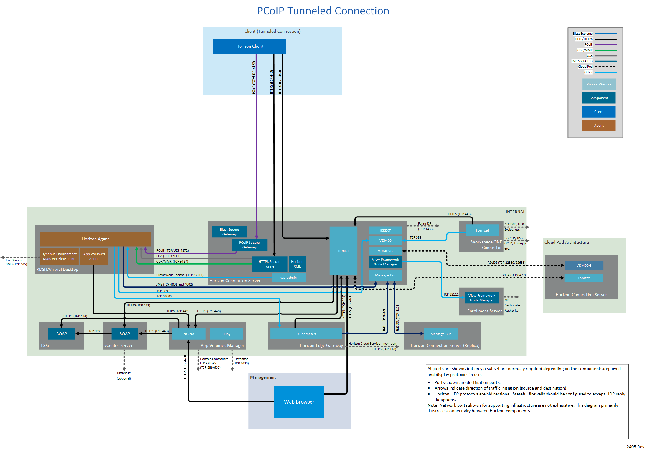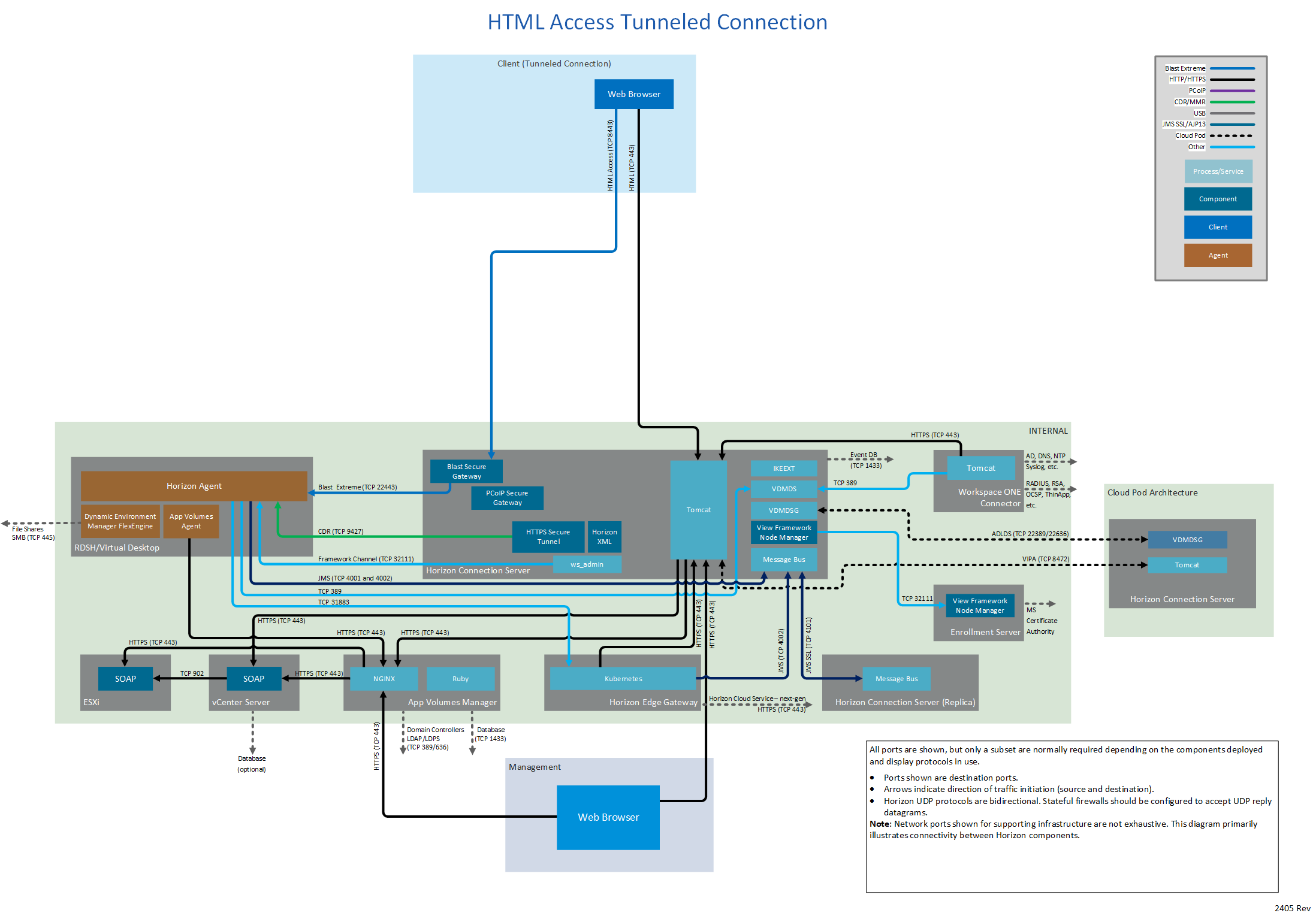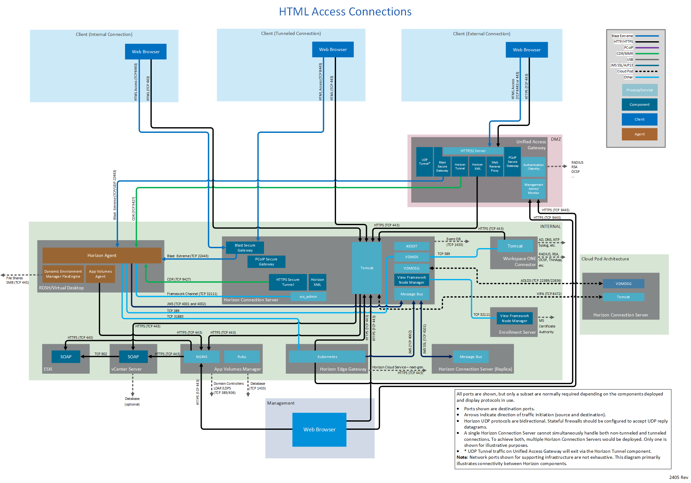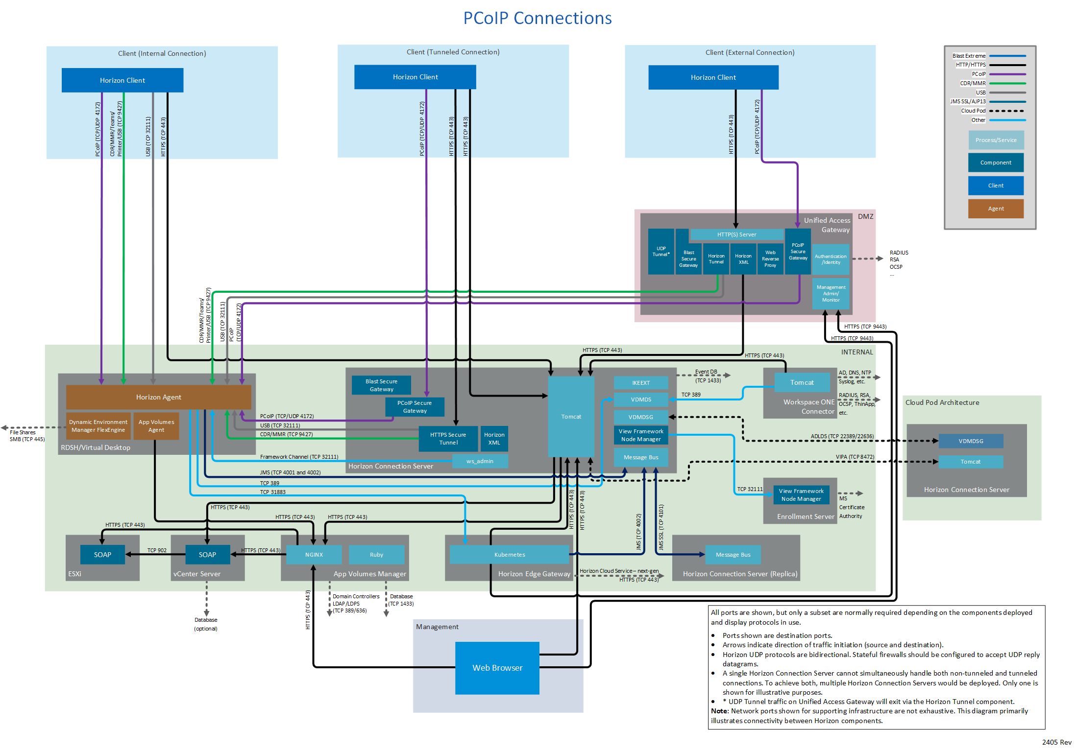 Network ports for connections between a client (either Horizon Client or a browser) and the various Horizon components vary by whether the connections are internal, external, or tunneled.