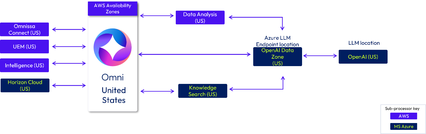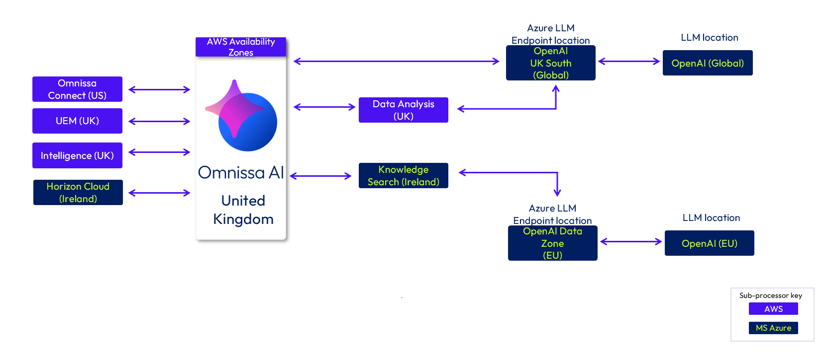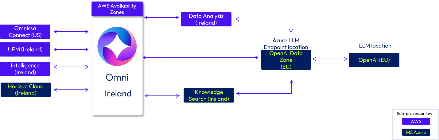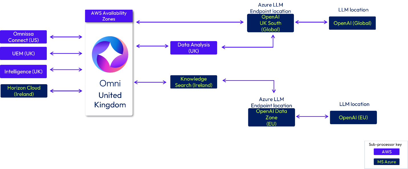 If you are a customer in the United Kingdom (UK), your data is stored in Omni in the UK. Data may be processed in Omnissa hosting infrastructure in the UK or Ireland. Azure Open AI LLM Endpoints are located in UK South (Global) and the EU Data Zone. The Azure LLM model will use hosting locations worldwide (Global) and in the EU.