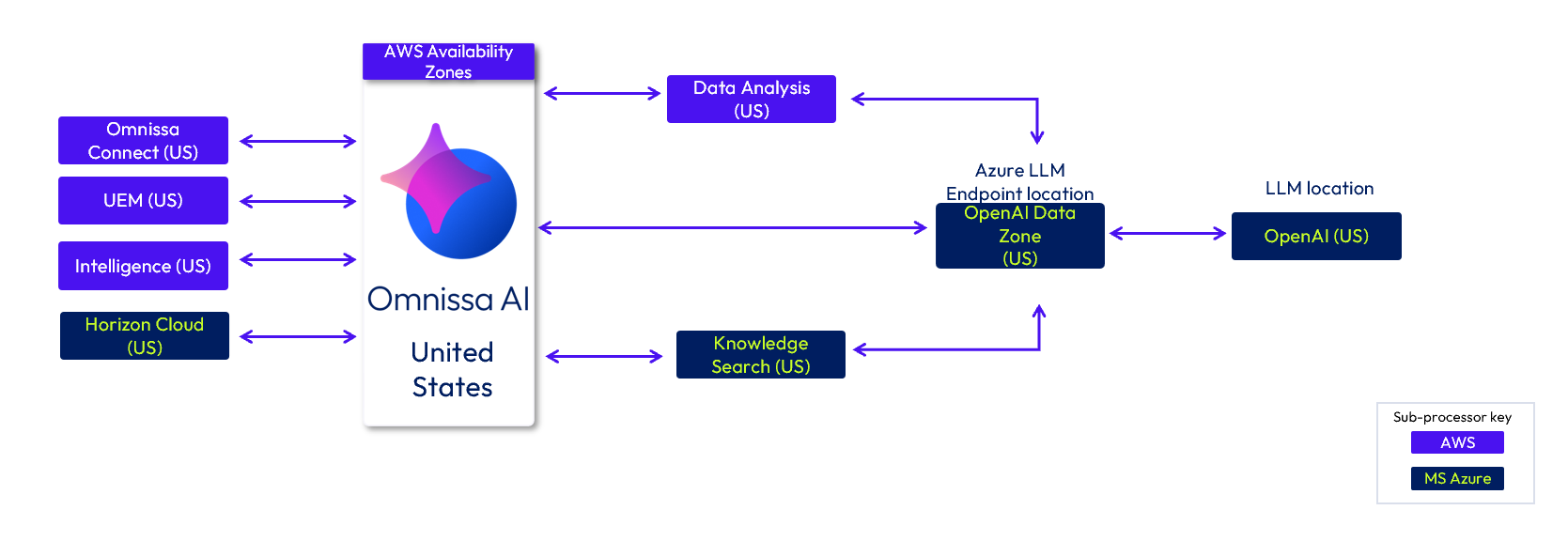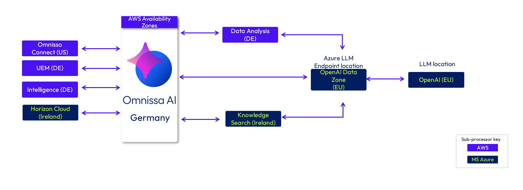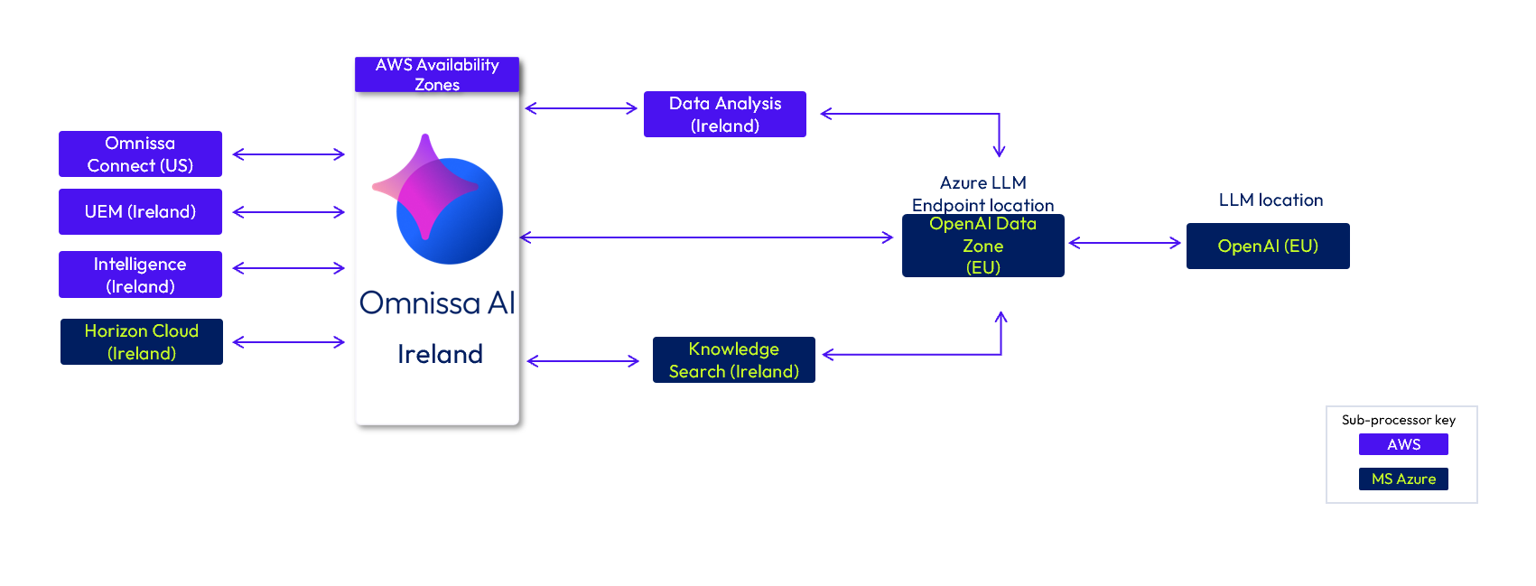 If you are a customer in the United Kingdom (UK), your data is stored in Omni in the UK. Data may be processed in Omnissa hosting infrastructure in the UK or Ireland. Azure Open AI LLM Endpoints are located in UK South (Global) and the EU Data Zone. The Azure LLM model will use hosting locations worldwide (Global) and in the EU.