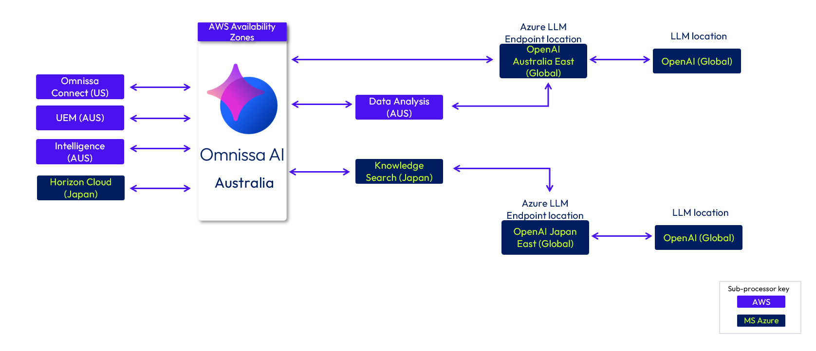 If you are a customer in Australia, your data is stored in Omni in Australia. Data may be processed in Omnissa hosting infrastructure in Australia or Japan. Azure OpenAI LLM Endpoints are located in Australia East (Global) and Japan East (Global). The Azure LLM model will use hosting locations worldwide (Global).