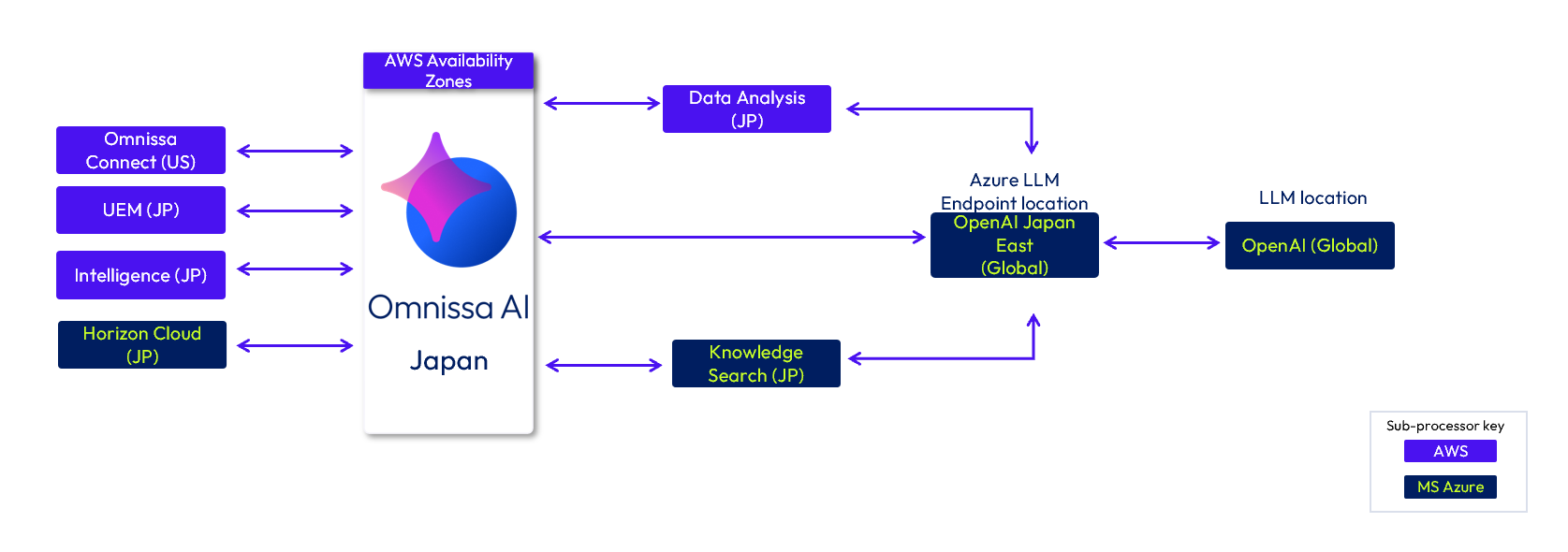 If you are a customer in Japan, your data is stored in Omni in Japan and may be processed in Omnissa infrastructure locations in Japan. Azure OpenAI LLM Endpoints are located in Japan East (Global). The Azure LLM model will use hosting locations worldwide (Global).