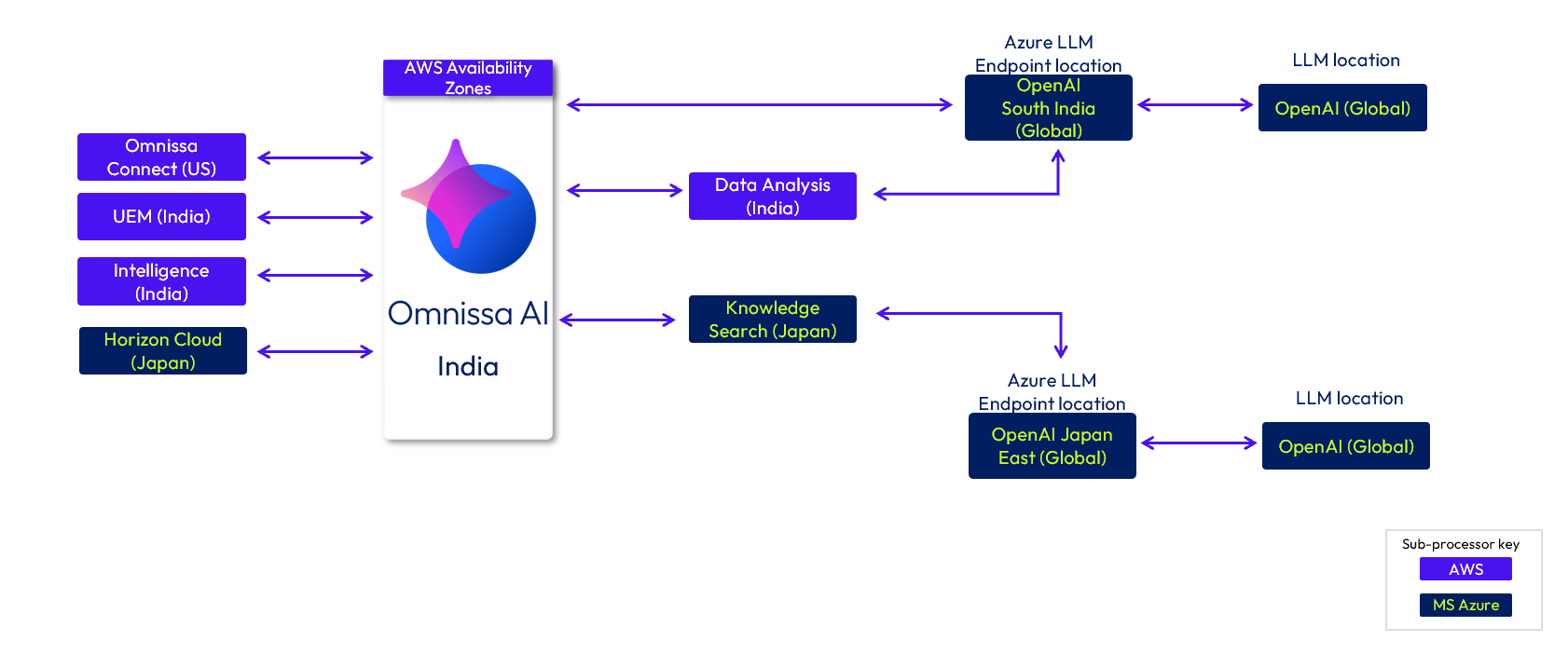 If you are a customer in India, your data is stored in Omni in India. Data may be processed in Omnissa infrastructure in India or Japan. Azure Open AI LLM Endpoints are located in South India (Global) and Japan East (Global). The Azure LLM model will use hosting locations worldwide (Global).