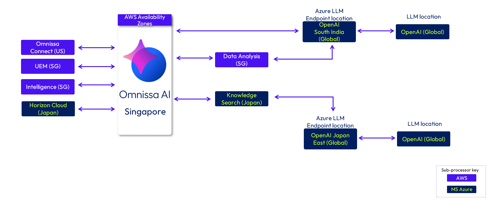 If you are a customer in Singapore (SG), your data is stored in Omni in Singapore. Data may be processed in Omnissa infrastructure in Singapore or Japan. Azure Open AI LLM Endpoints are located in South India (Global) and Japan East (Global). The Azure LLM model will use hosting locations worldwide (Global).