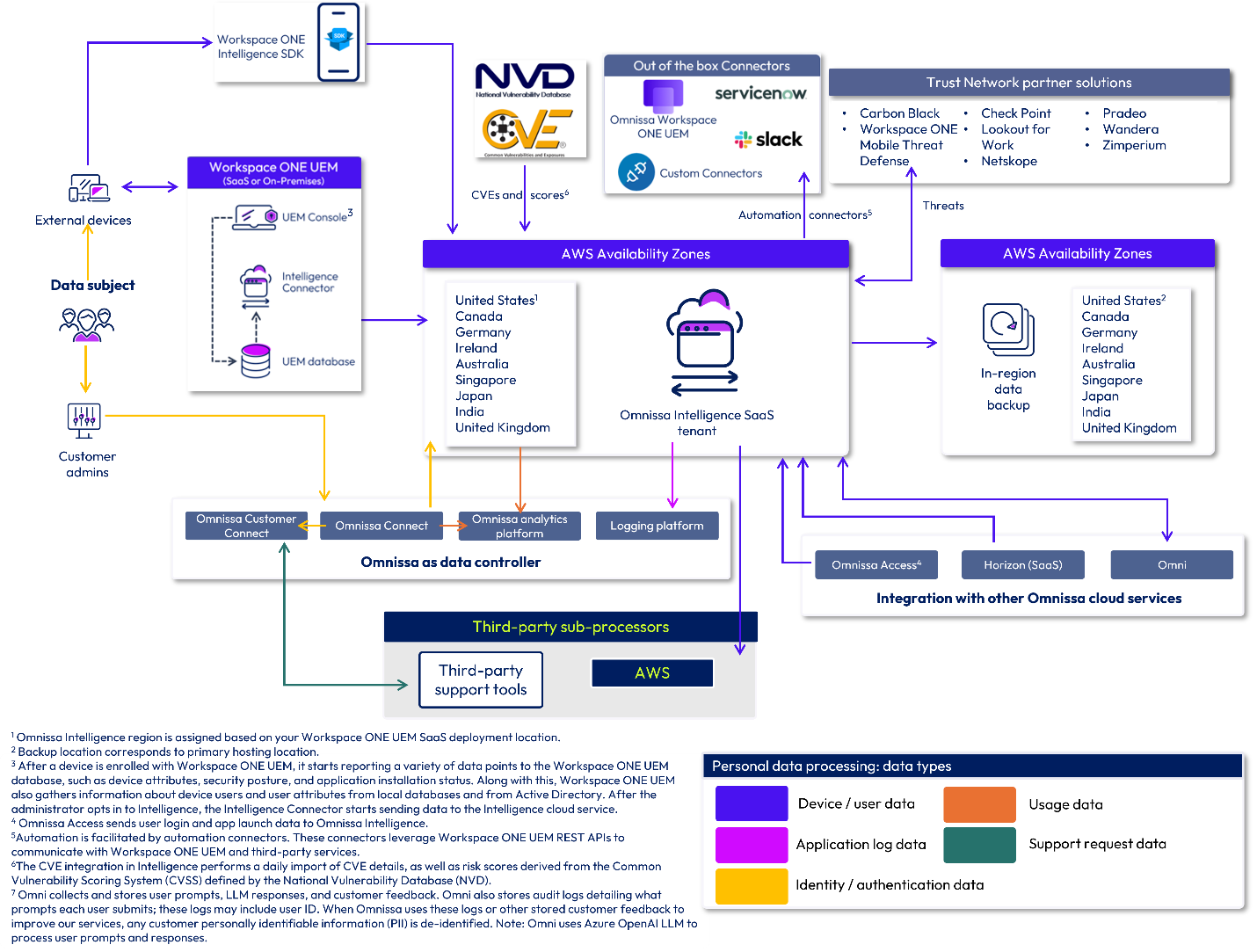Omnissa Intelligence service offerings are available in the U.S., Canada, United Kingdom, the European Economic Area (EEA), and Asia-Pacific (APAC) regions. Omnissa Intelligence service infrastructure also hosts Omnissa Intelligence for Consumer Apps and Omnissa Intelligence Digital Employee Experience Management (DEEM). Omnissa Intelligence deployments are hosted in Amazon Web Services (AWS) and disaster recovery is provided using AWS AZs within the same region. For data processing locations, refer to the sub-processor listing.