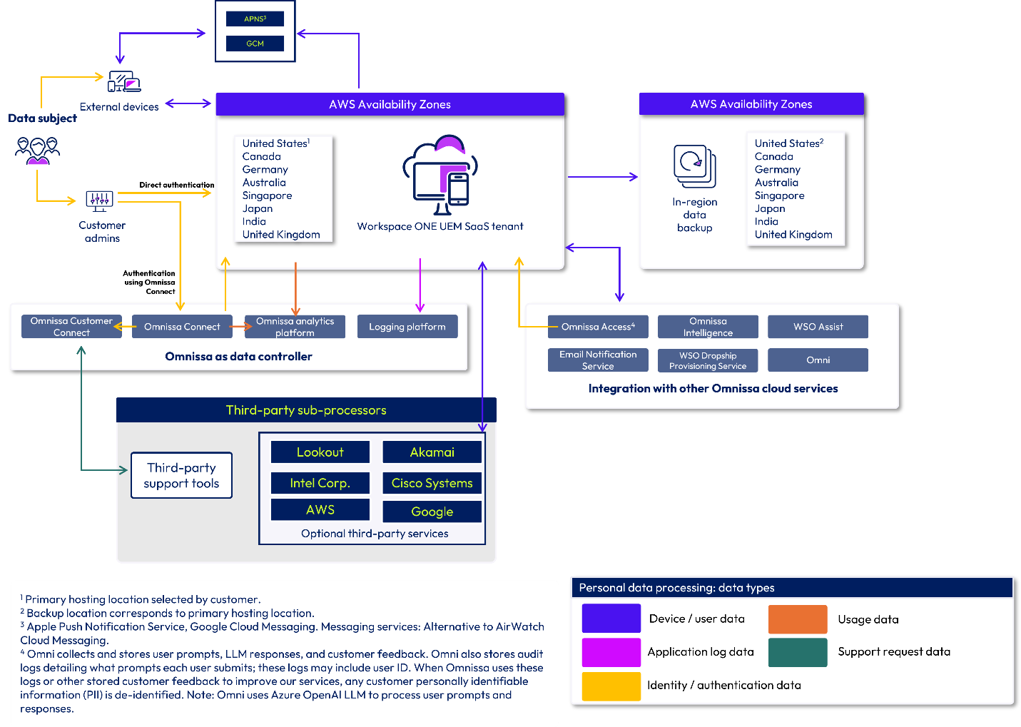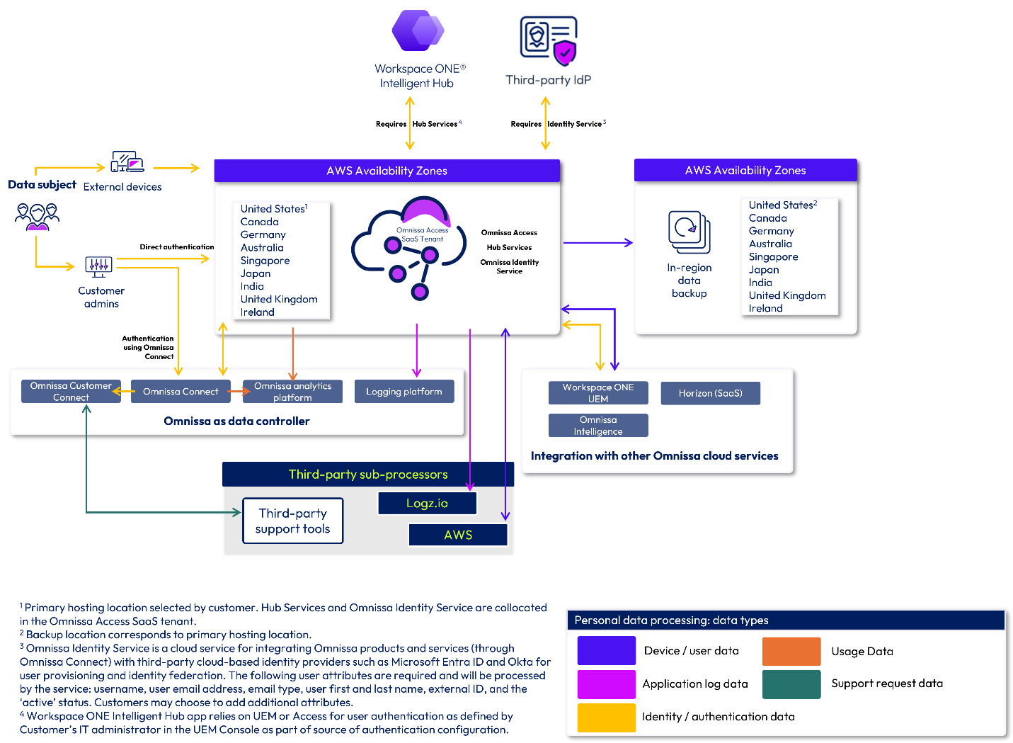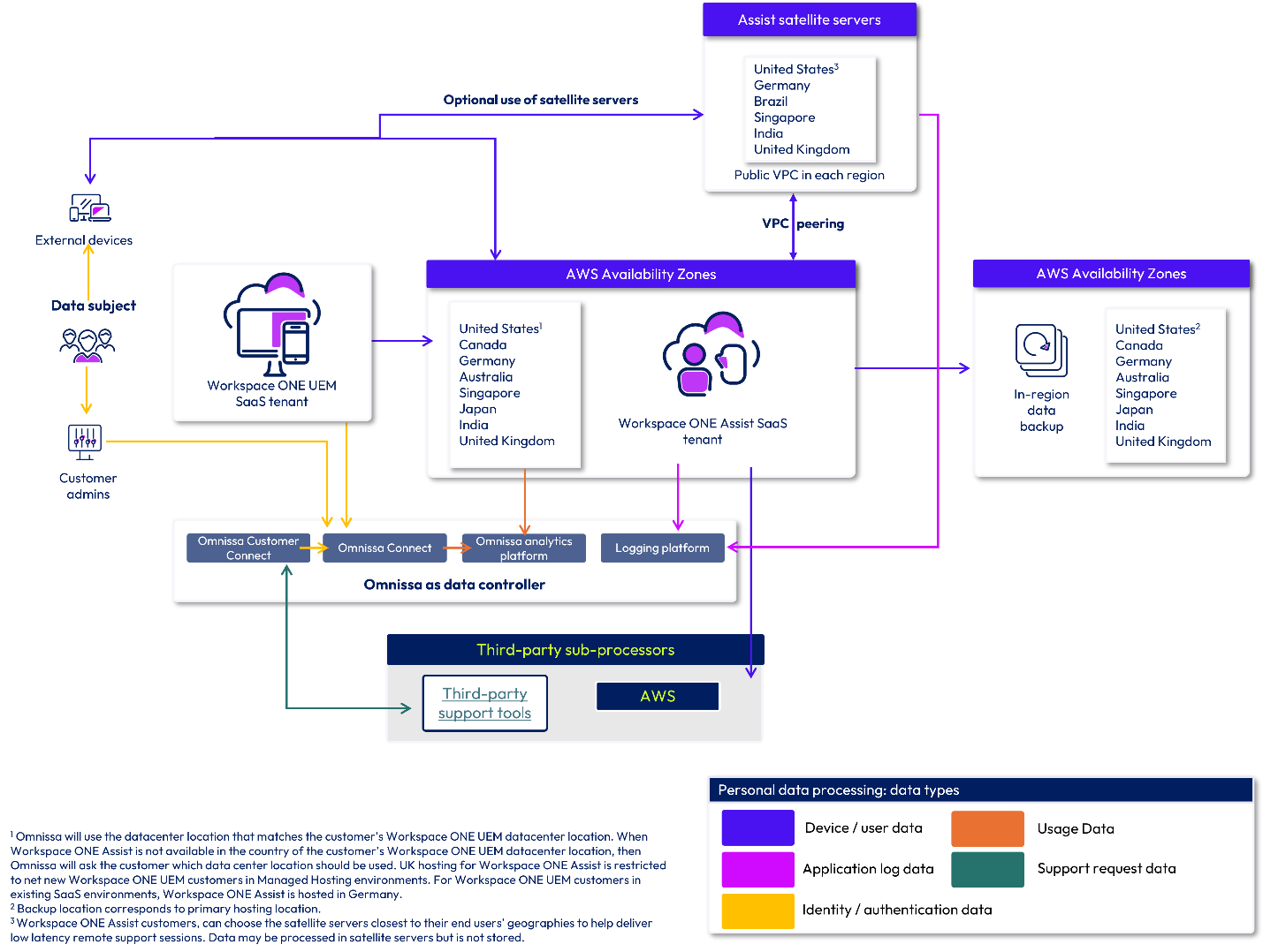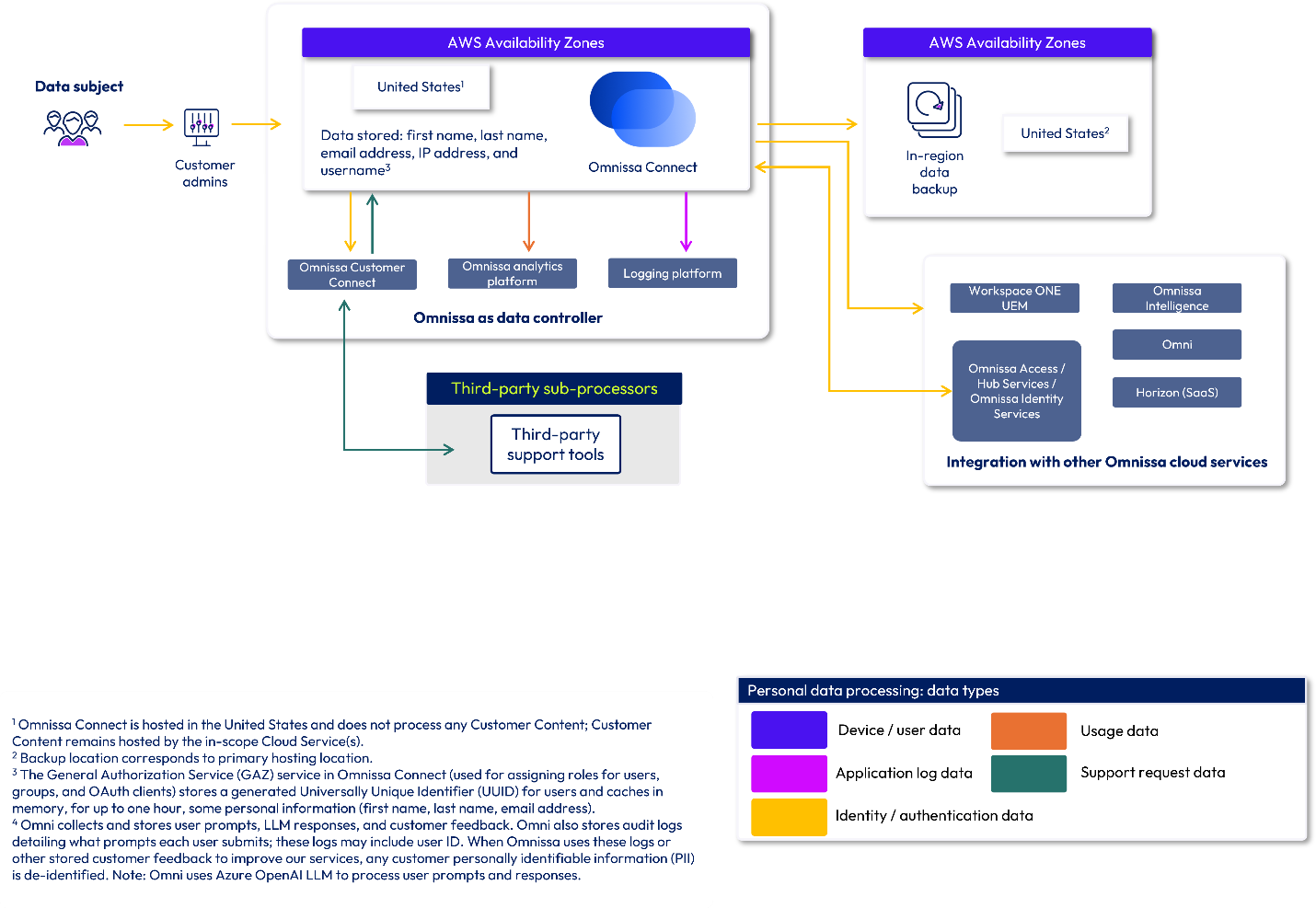 The purpose of these diagrams is to clearly illustrate how data enters the system, how it is used, where it is stored, and how it flows between the Customer, Omnissa, and third-party sub-processors. Note that Federal Risk and Authorization Management Program (FedRAMP), on-premises, Omnissa ancillary services, and third-party offerings are not in scope for this document.