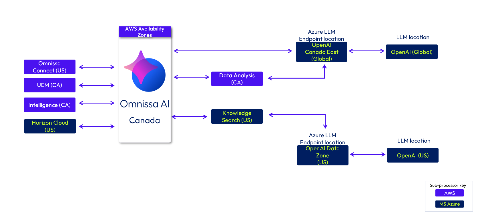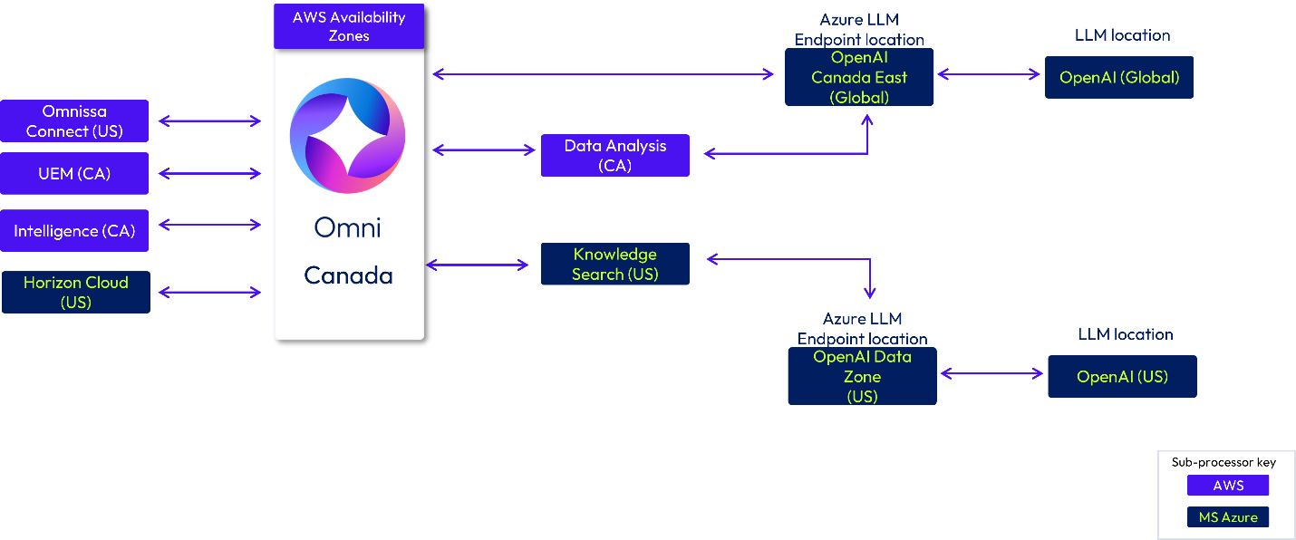 If you are a customer in Canada (CA), your data is stored in Omni in Canada. Data may be processed in Omnissa infrastructure located in Canada or the US. The Azure OpenAI LLM Endpoint locations are Canada East (Global) and the OpenAI US Data Zone. The Azure LLM model will use hosting locations worldwide (Global) and in the US.