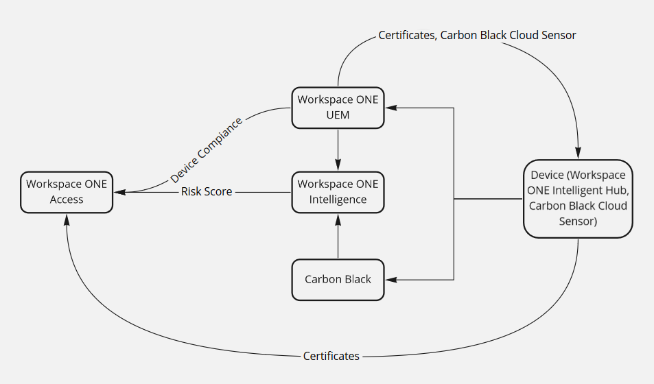Third-party products can be used in place of some components to achieve comparable functionality. For example, instead of (or in addition to) Carbon Black Cloud, other endpoint detection and response (EDR) products and mobile threat defense (MTD) products can feed information about device security posture into the Workspace ONE Trust Network.
