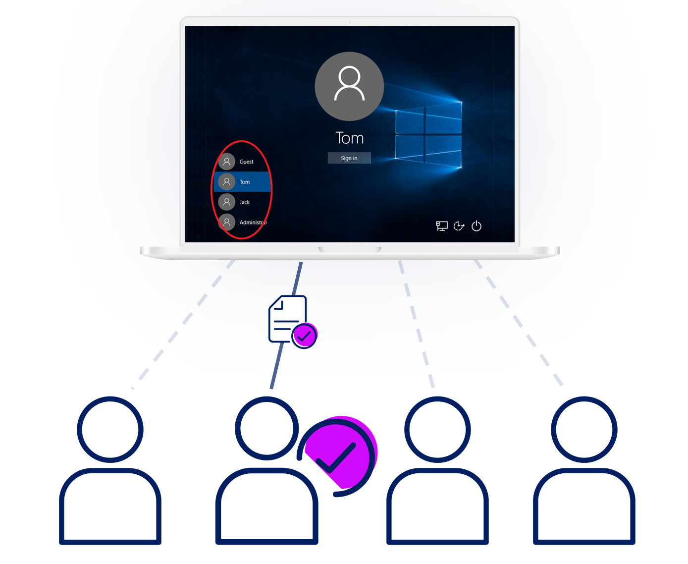 In the example below, Tom is currently accessing a Windows Multiuser device. When Tom logs off, and a new user, Lee, accesses this computer, the device does not need to enroll once again. The existing enrollment will transfer, and once Lee authenticates, the proper applications and settings will be pushed to this device.