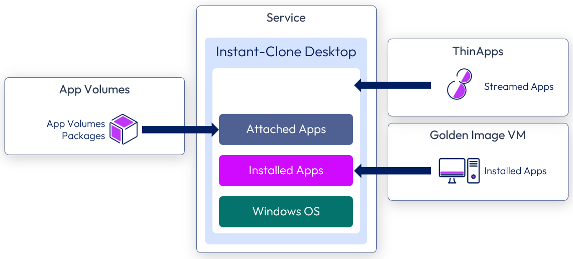 To set up this container-style technology that attaches applications to a VM when the user logs in, you must install redundant instances of App Volumes Manager, create packages, which store applications in shared read-only virtual disks (VMDK files), and, optionally, create writable volumes if users need to install their own applications.