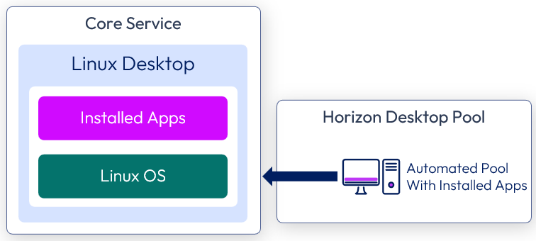 The Enterprise Application Workspace service has a similar configuration to the Enterprise Productivity service, but also includes access to Horizon applications running on Horizon or Horizon Cloud. Horizon resources can be synced with Workspace ONE through an outbound-only connection from the Workspace ONE Access Connector. This method allows entitlements to sync to the service.