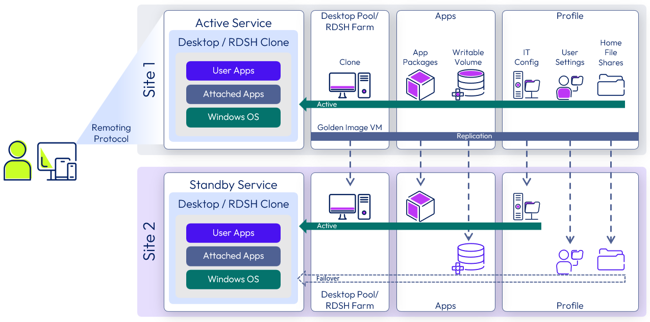- Any services that have been deployed on-premises, including Horizon 8, App Volumes, Dynamic Environment Manager, Workspace ONE Access, and Workspace ONE UEM, should have been deployed across multiple sites to provide resilience and disaster recovery capabilities.