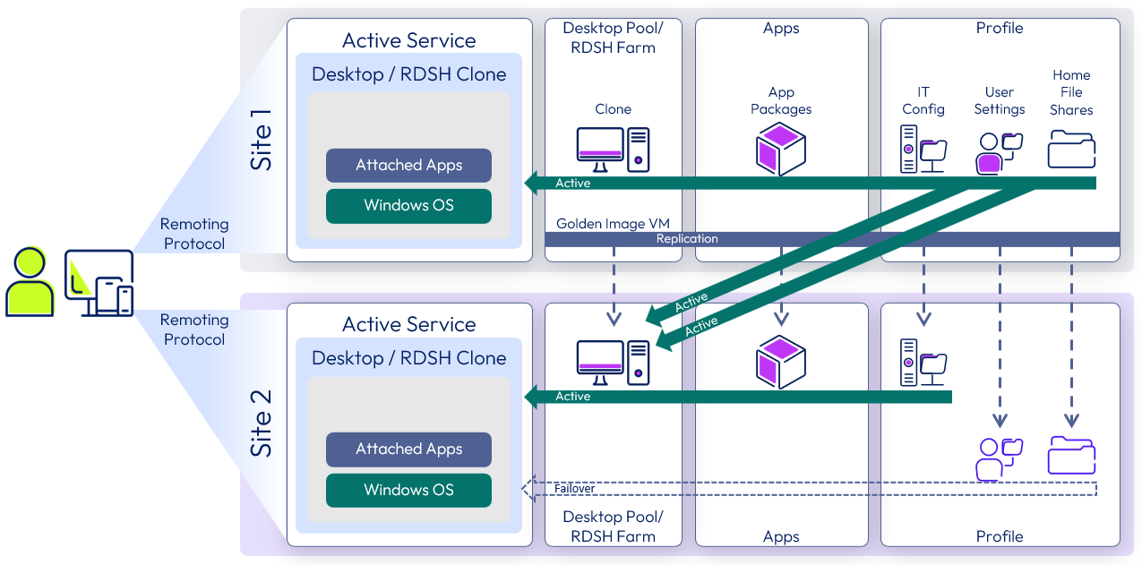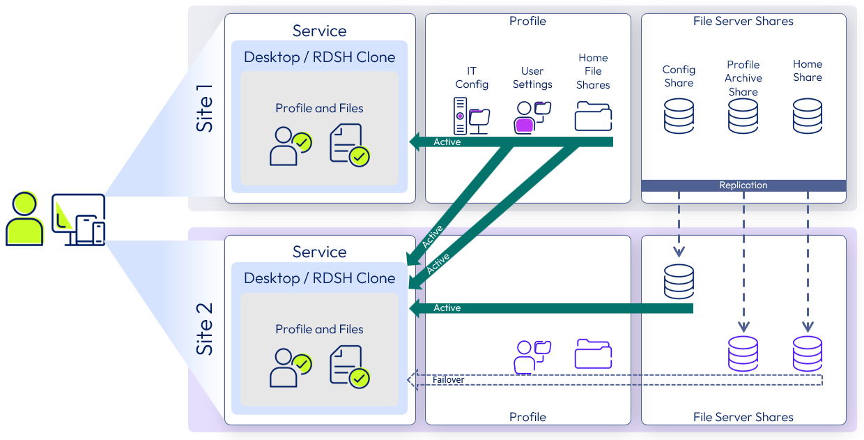 To manage user settings, user data, and users’ access to applications, set up file shares in Site 1, set up DFS-N so that the file shares are replicated to Site 2, and determine which site is primary for each user so that the profile service can function as shown in the following figure.