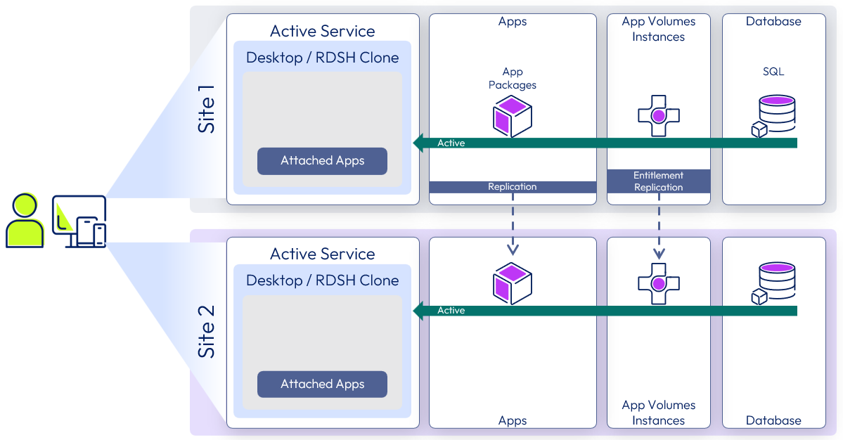 - Application packages can be actively consumed in both sites. Packages can be replicated from one site to another. Entitlements are replicated from the source App Volumes instance to the target instances.