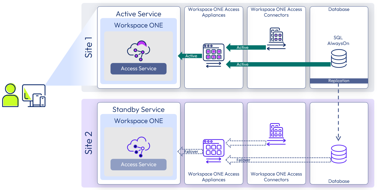 The Workspace ONE Access service provides a common entry point to all types of applications, regardless of which data center is actively being used. To build this service, you deploy three instances in Site 1, three instances in Site 2, and set up global load balancing.