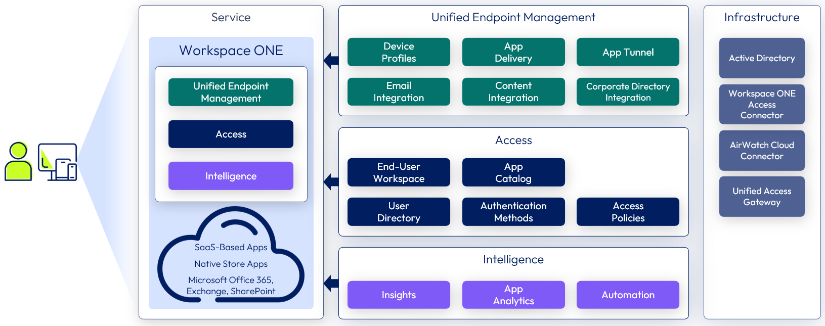 | Device enrollment | All devices in the Enterprise Productivity service are required to enroll using the Workspace ONE Intelligent Hub. These devices are likely to have valuable enterprise data on them and so require a higher level of control and security. |