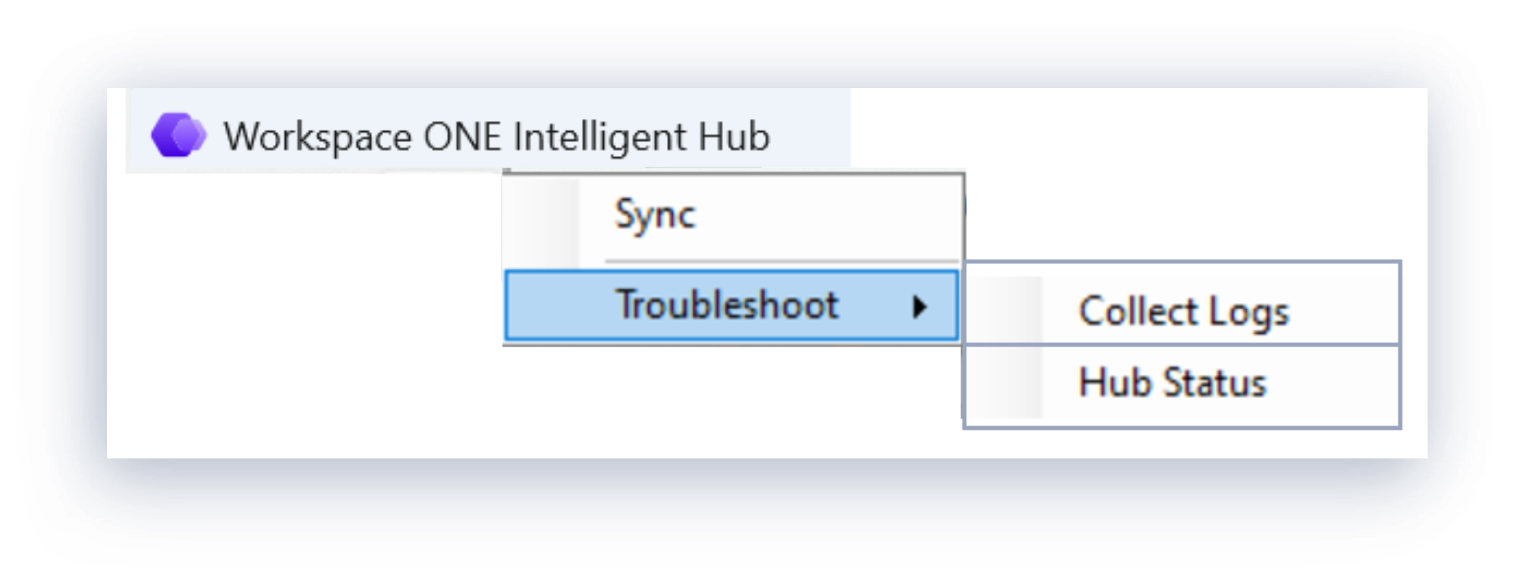 To troubleshoot on the local device, right-click the Workspace ONE Intelligent Hub icon in System Tray > Troubleshoot. Two options are presented: