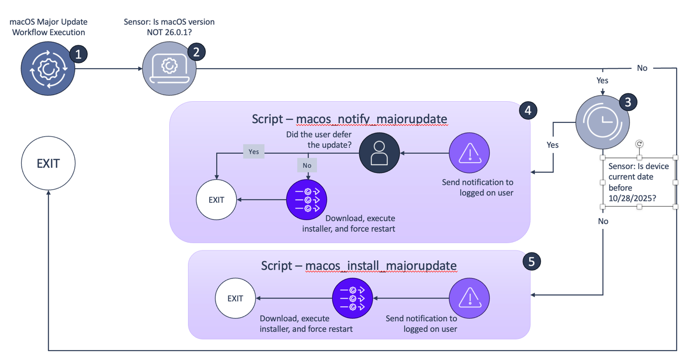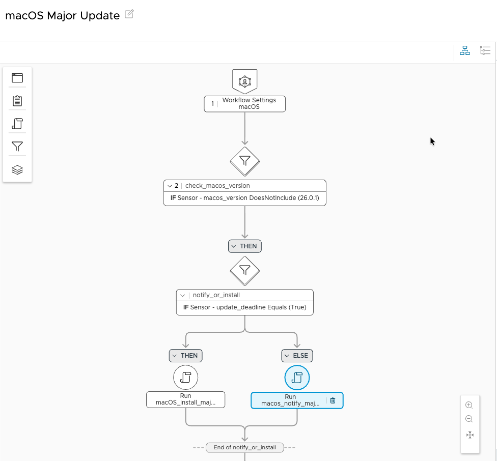 - The macos_version sensor checks what version of macOS is installed on the device. If the version is NOT 26.0.1, the workflow will move to step 3. If it is 26.0.1, the workflow will exit.