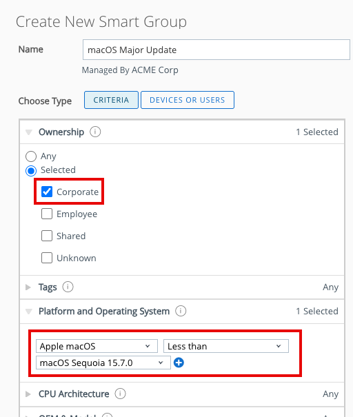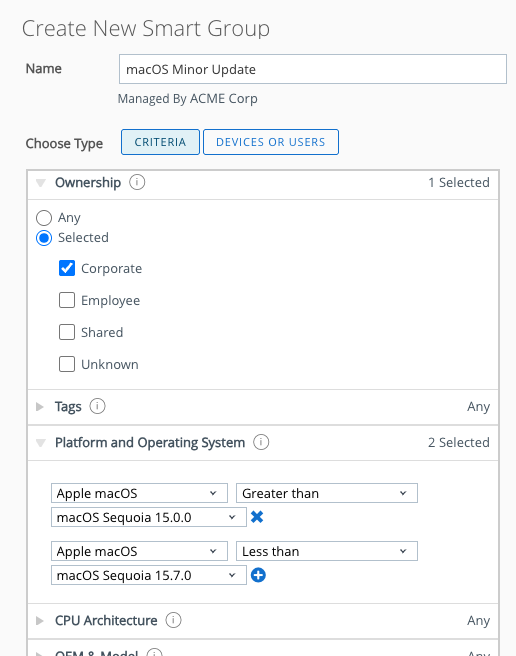 - Expand Platform and Operating System. From the drop down, select Apple macOS. Change the condition to Less Than and select macOS Sequoia 15.0.0. Click the plus sign (+) and select Apple macOS, Greater Than or Equal To, and macOS Sequoia 15.7.0 from their respective dropdowns.