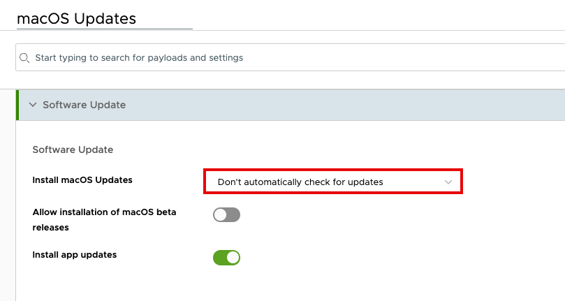 The macOS Software Update Utility regularly scans for updates and can be configured to automatically download and install OS updates. However, you might want more control over which updates are installed on your devices. You can manage automatic updates using a device profile in Workspace ONE UEM.