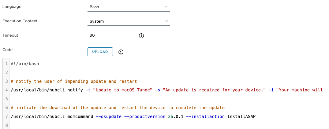 /usr/local/bin/hubcli notify -t "Update to macOS Tahoe" -s "This may take up to 1 hour." -i "Your machine will restart automatically. You will be notified when your device will be restarted. You have until Oct. 31st to update your device." -a "Begin" -b "/usr/local/bin/hubcli mdmcommand --osupdate --productversion 26.0.1 --installaction InstallASAP" -c "Update Later"