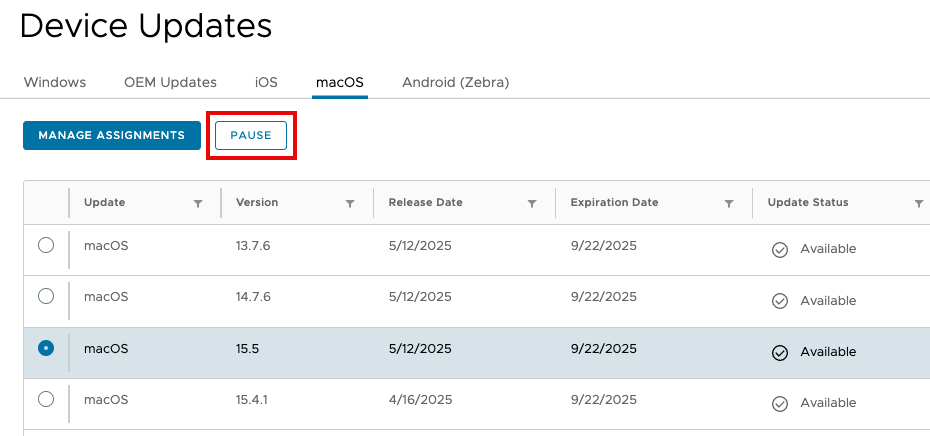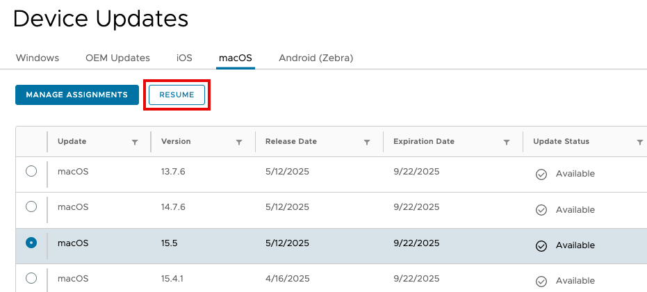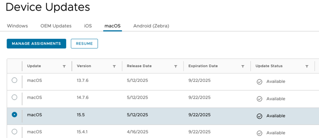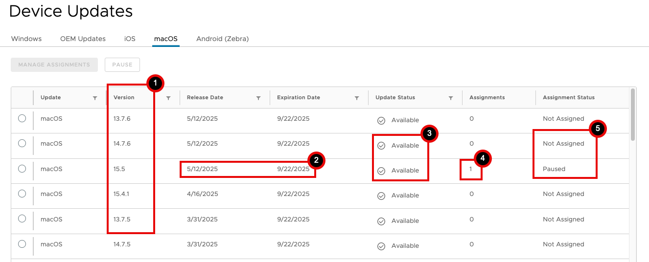 Note: The Assignments number does not necessarily equate to the number of smart groups assigned to the update. - Assignments Status – For each macOS update version, Workspace ONE displays whether that update has been Assigned to devices or Not Assigned. Additionally, if an administrator has paused an update, the update displays as Paused.