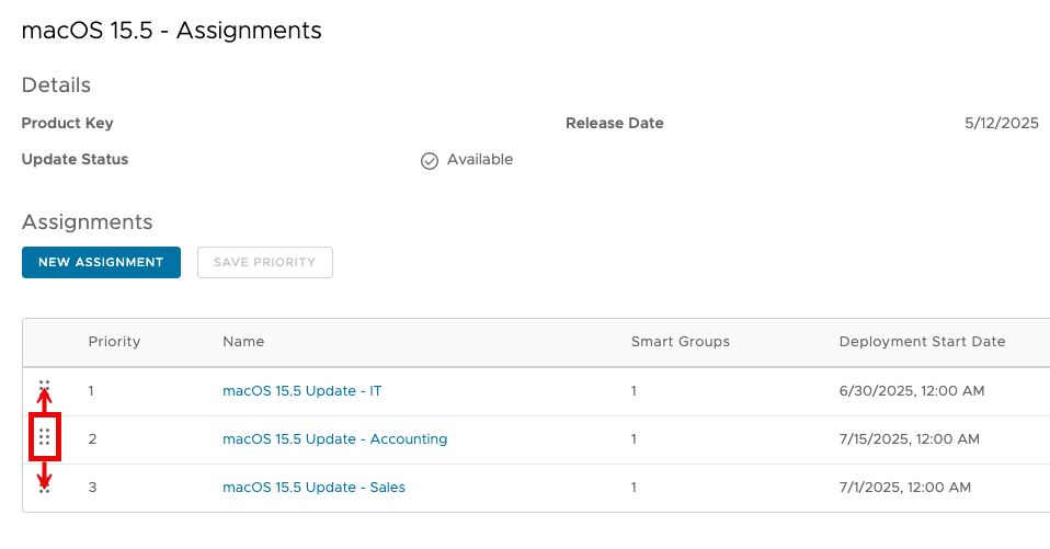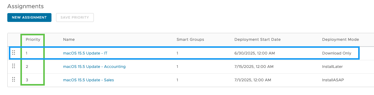 - Highest Priority Wins: If the same macOS device exists in multiple assignments for a single macOS Update in a single OG, the assignment with the highest priority takes precedence.
