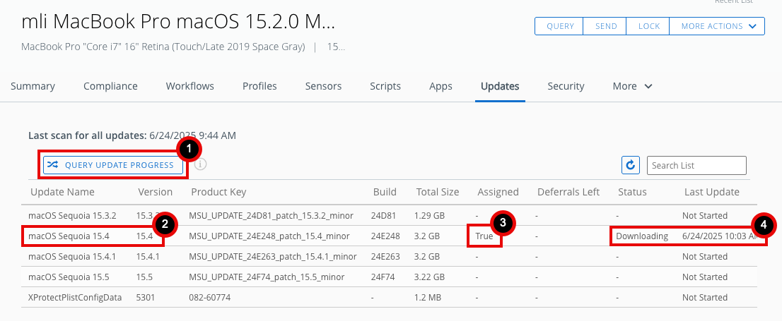 - Assigned – The Assigned column shows if an update has been assigned for deployment to this device.