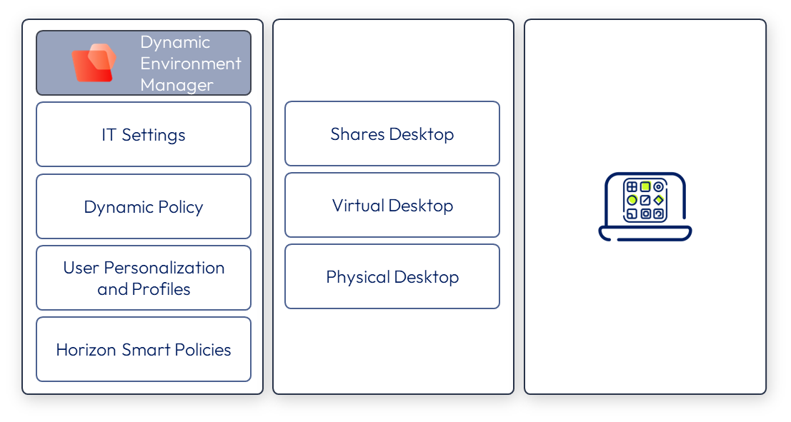 Dynamic Environment Manager maps environmental settings such as networks and printers, and dynamically applies end-user security policies and personalization. You can manage and control the user environment, including user profiles, settings, and configuration options.