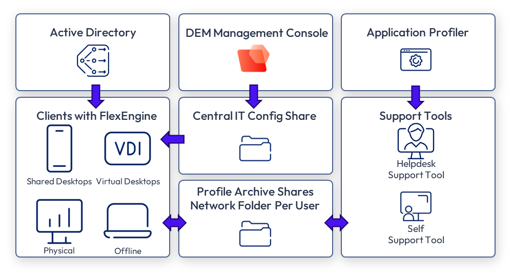 Dynamic Environment Manager consists of a number of interlocking components that work together to manage user profiles, application, and persona settings, and provide a personalized desktop experience. The components are described below.